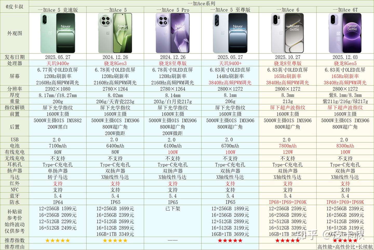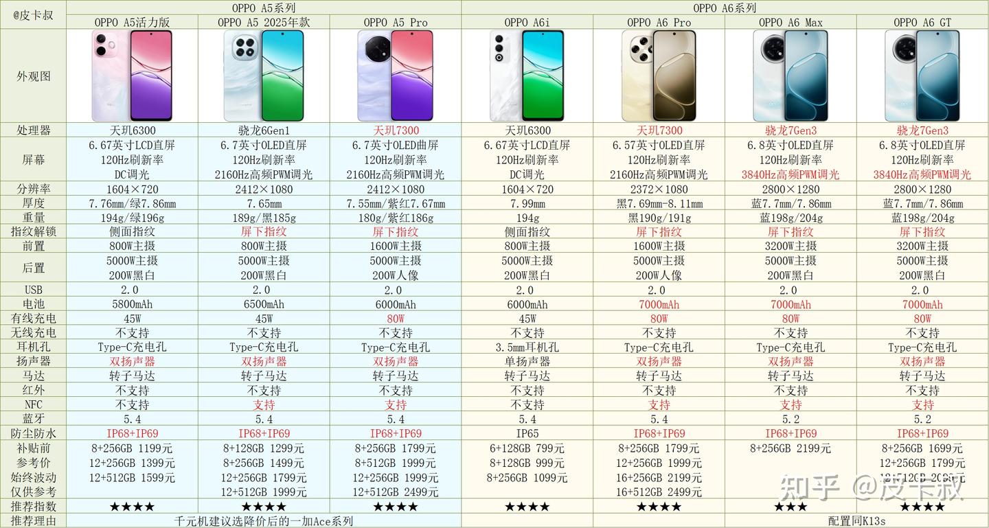 OPPO A系列都是一些入门机型,本篇不再介绍。OPPO的千元机目前建议直接选一加ACE5或一加ACE5竞速版。参数对比如图: