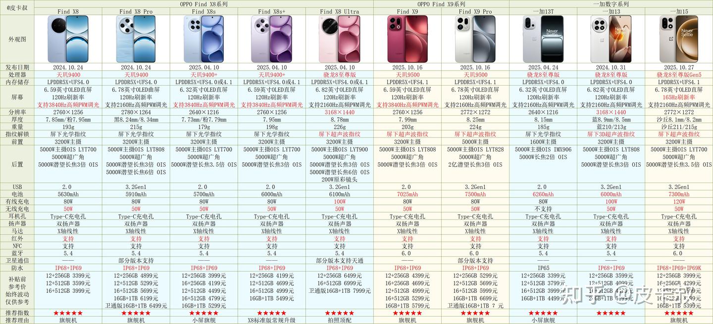 两个品牌的旗舰系列目前在售的主要是OPPO Find X8系列和一加13系列。参数对比如图: