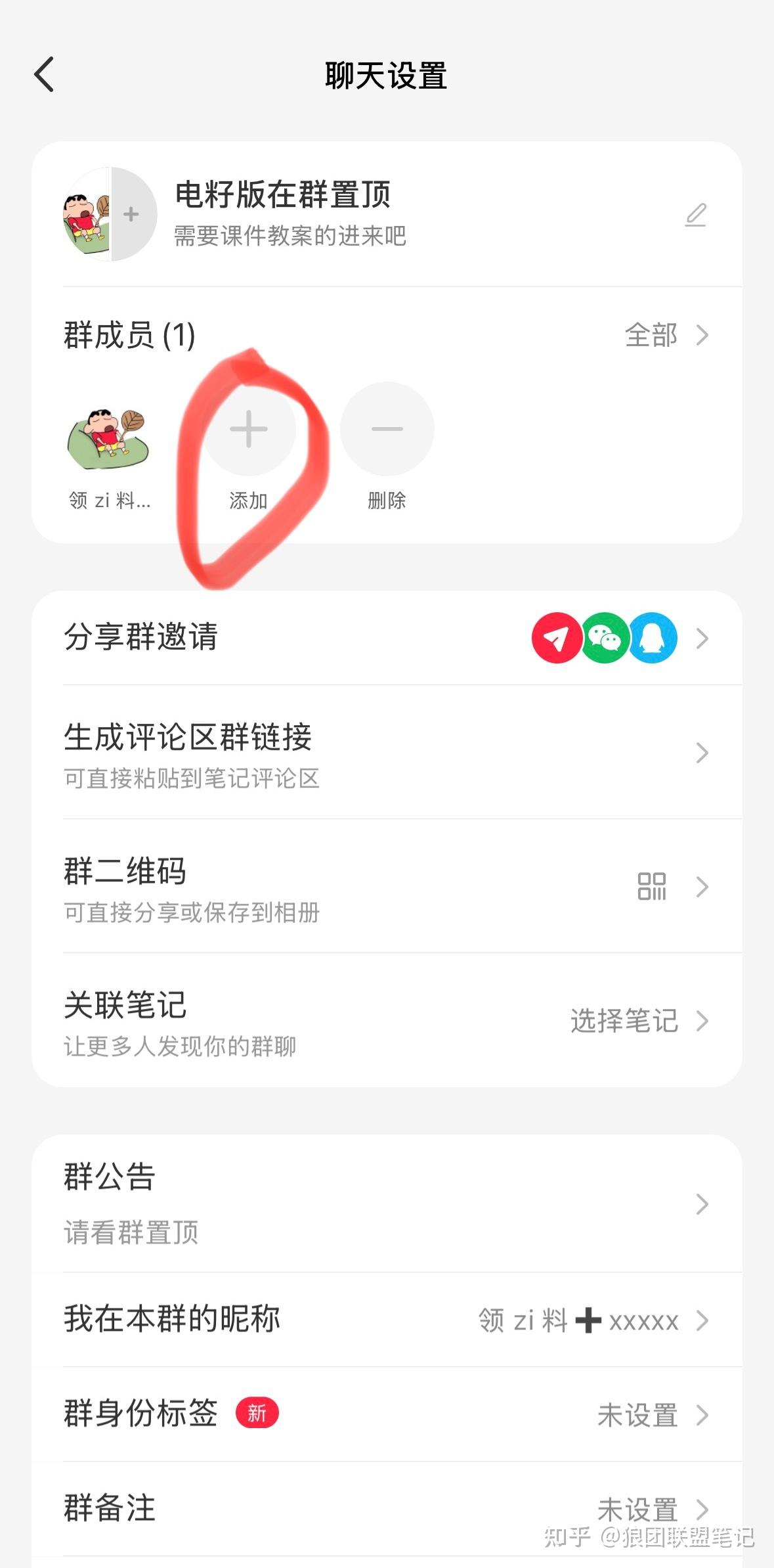 将群公告设置为「请看群置顶」,本群昵称设置为「领 zi 料➕引流的微信」。
