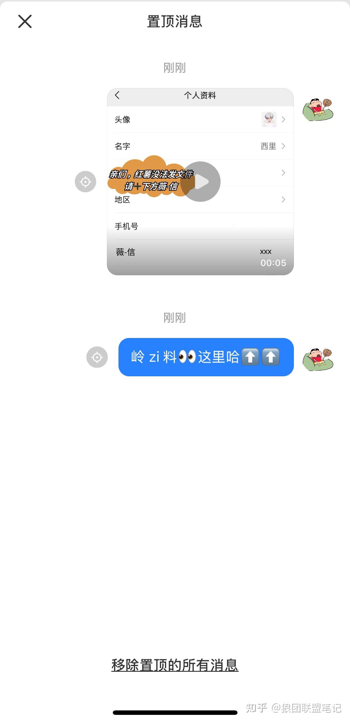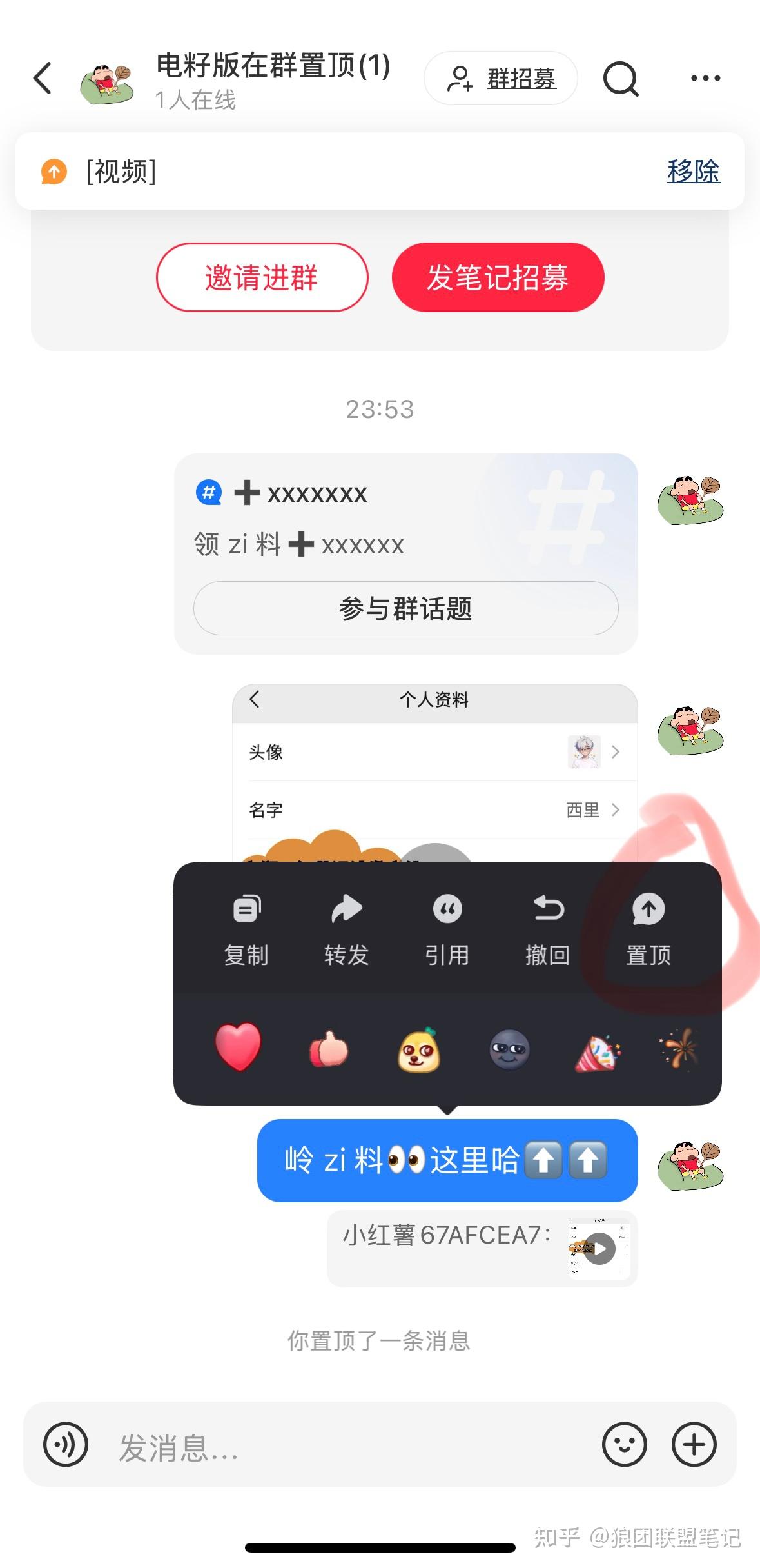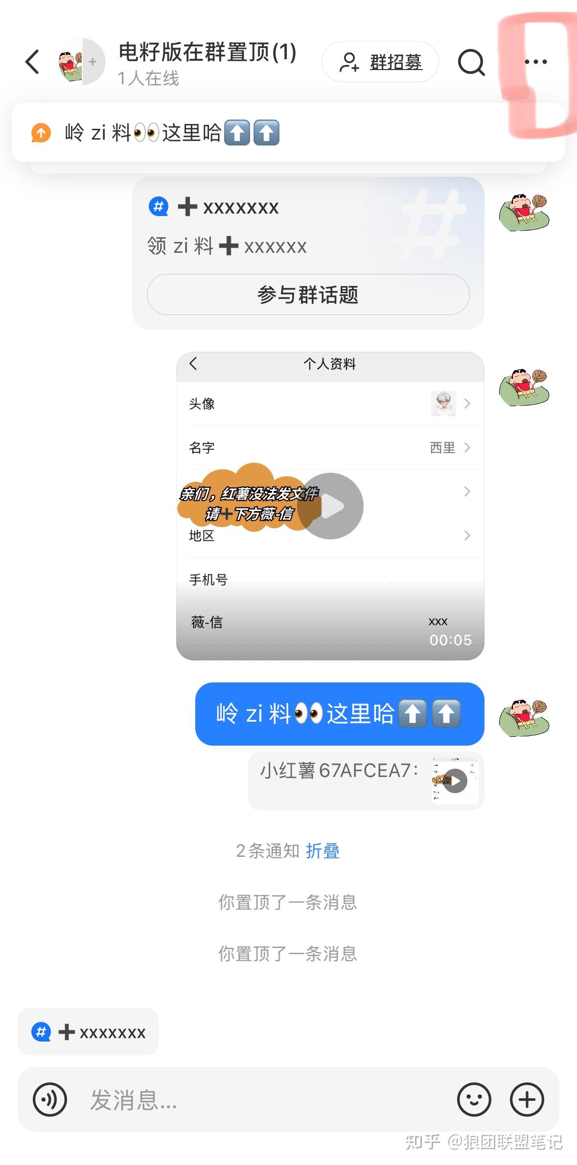 将制作的引流视频发送到小红书群,长按引流视频,发送「岭 zi 料 这里哈⬆️⬆️」,然后将这两条消息置顶。