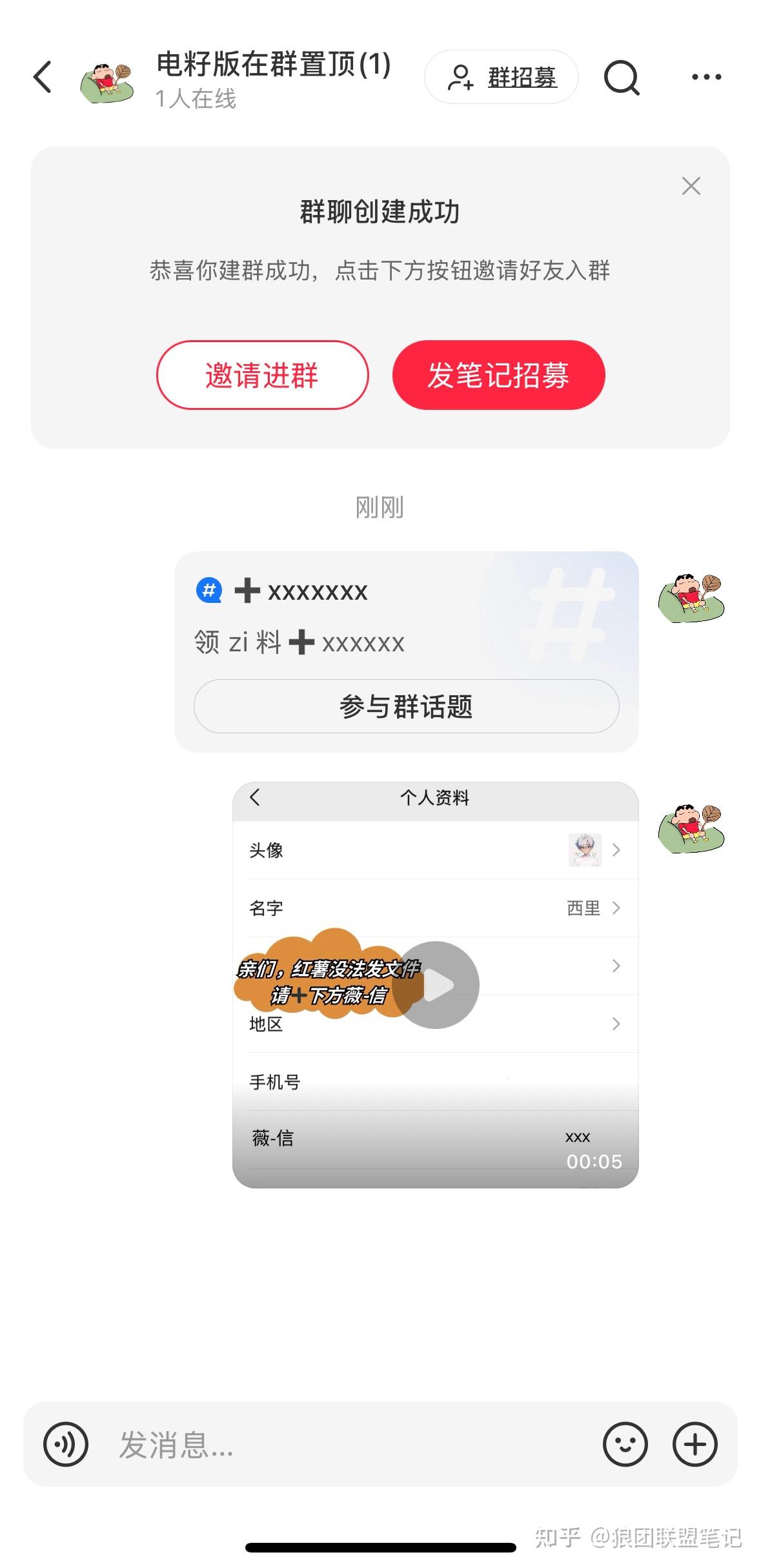 如果有笔记爆了,或者群里入群人数多了,间隔 15-25 人可以用小号往小红书群内发引流视频。