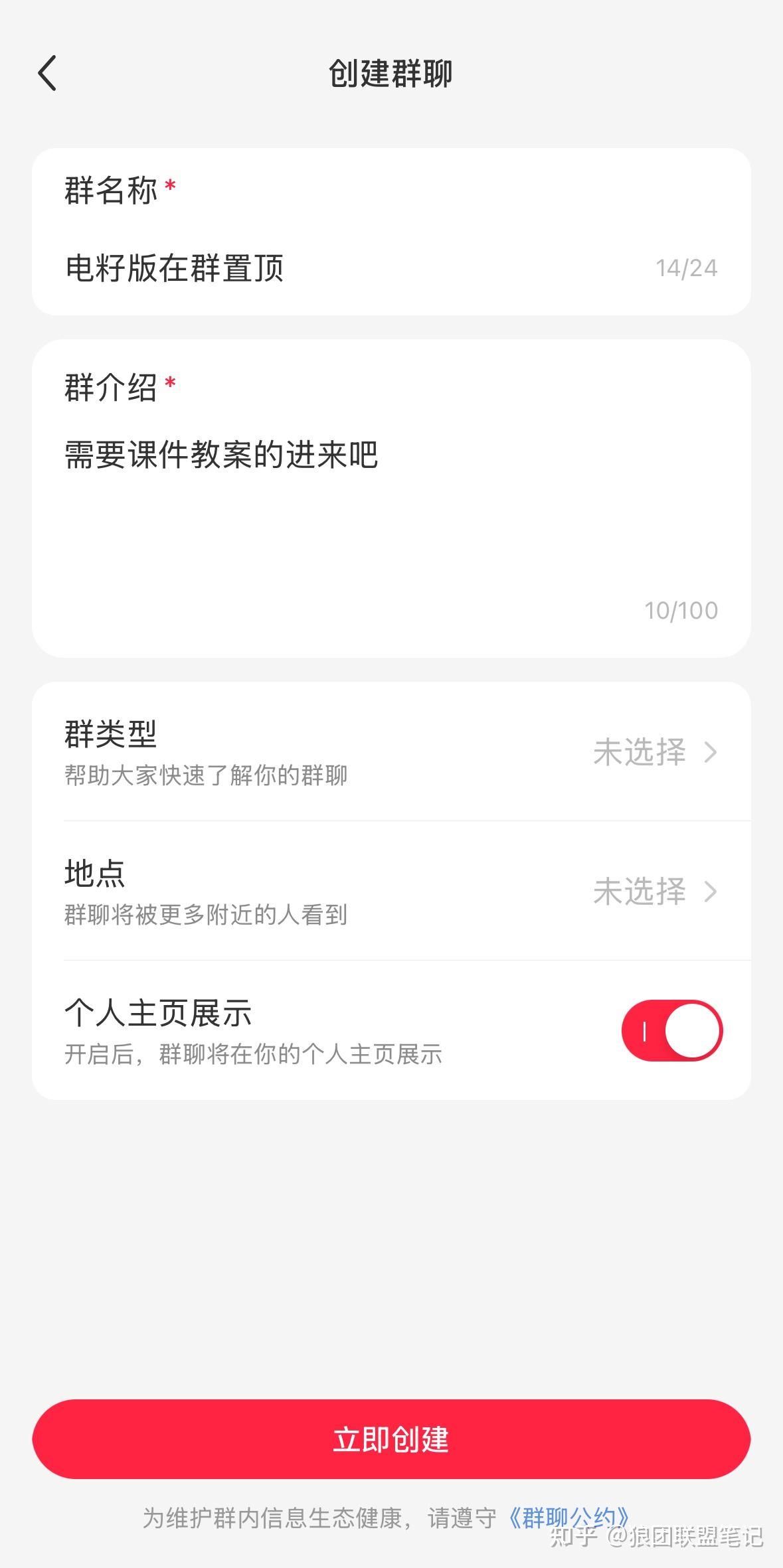 先点击「发现群聊」,点击「创建群聊」,群名称设置为「电籽版在群置顶」,群介绍可以设置为「需要课件教案的进来吧」