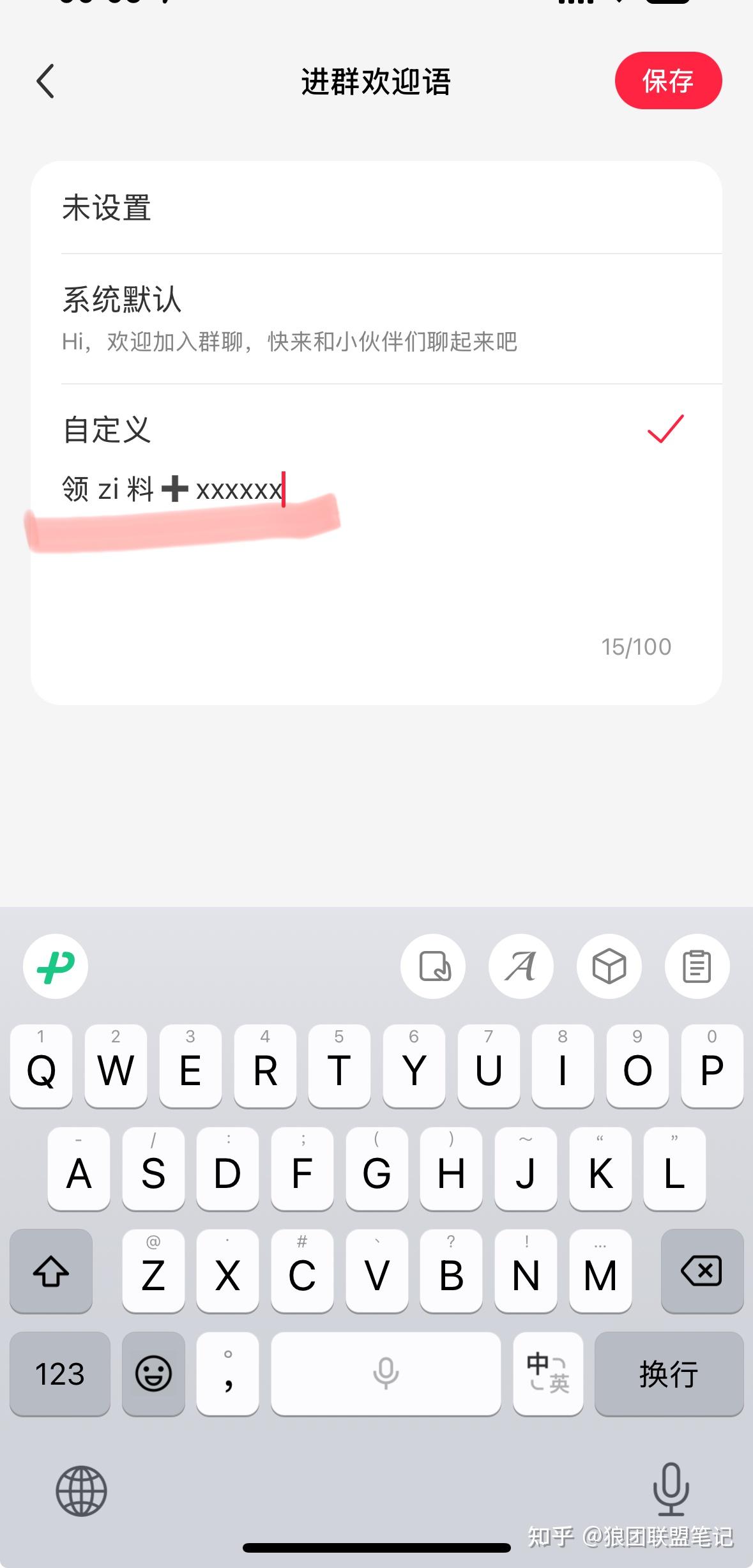 设置群欢迎语,将群欢迎语设置为「领 zi 料➕被引流的微信」