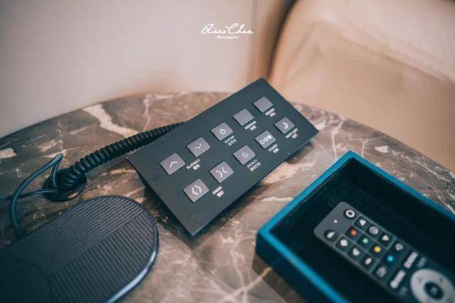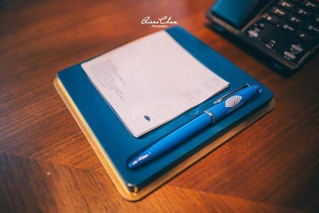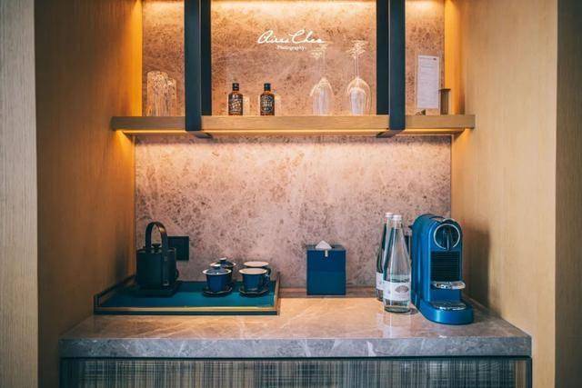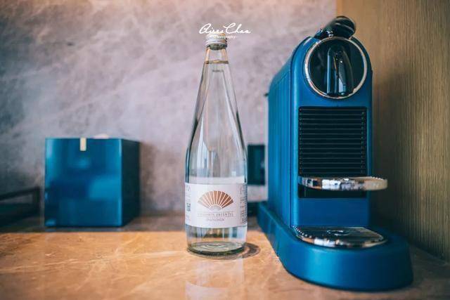 茶具、咖啡机、纸巾筒以及一次性卫生用品的盒子等全都是蓝色,饮用水都是玻璃瓶的,还印着深圳文华东方的Logo。