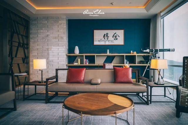 客房的起居区域是我最喜欢的地方,主色调依旧是青灰色和原木色,点缀着酒店特有的蓝色,圆形的书桌以休闲为主,但也能为办公提供便利。