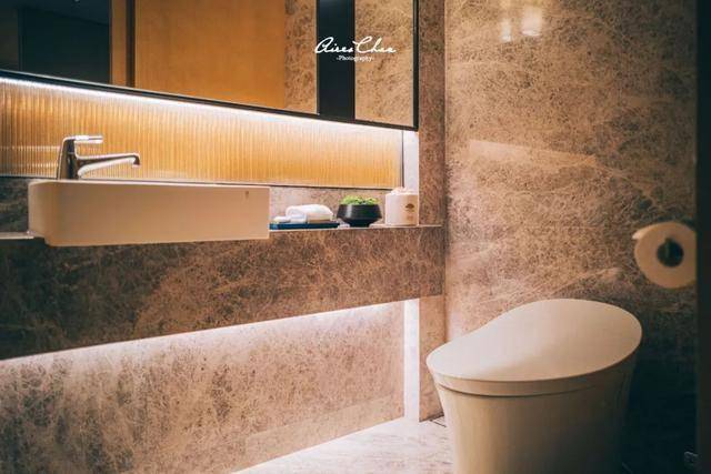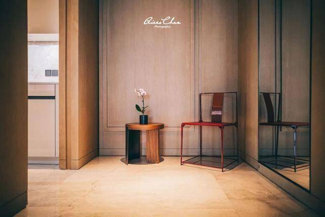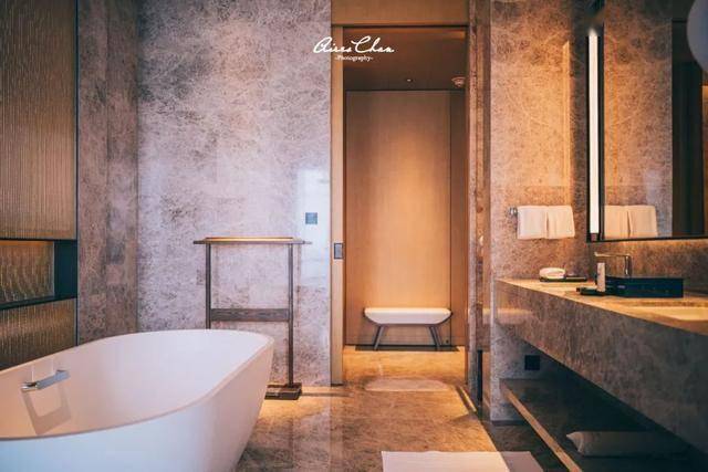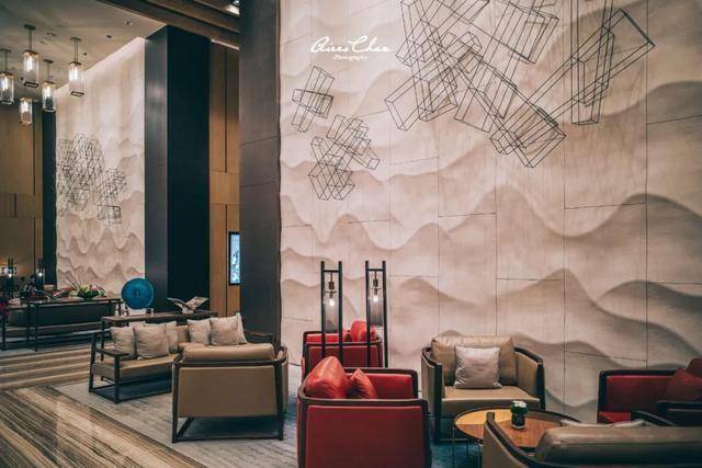 背景墙上的波浪描绘了深圳作为滨海城市的特点,公区的中式家具则来自中国设计师蒋琼耳与爱马仕合作的时尚和生活方式品牌「SHANGXIA上下」,一堆看上去不起眼的天价家具,很符合这家文华东方内敛的调性。