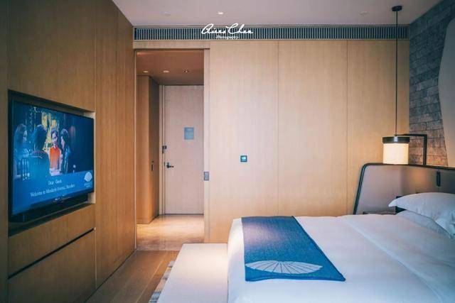 进门一侧是非常宽敞的步入式衣帽间以及换鞋位,客房的青灰石砖墙源自深圳的渔村旧宅,「深圳蓝」的羊毛毯回应着酒店的主色调。