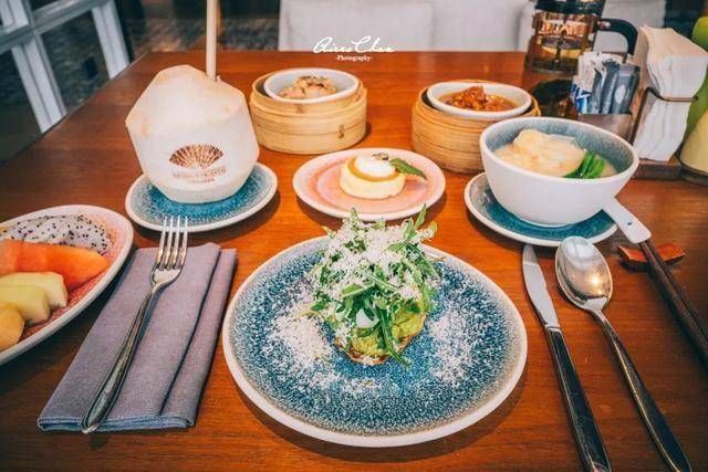 早餐是半自助的形式,自助餐台可选的品种非常多,果汁是鲜榨的,还有新鲜的椰青,在城市酒店之中非常少见。