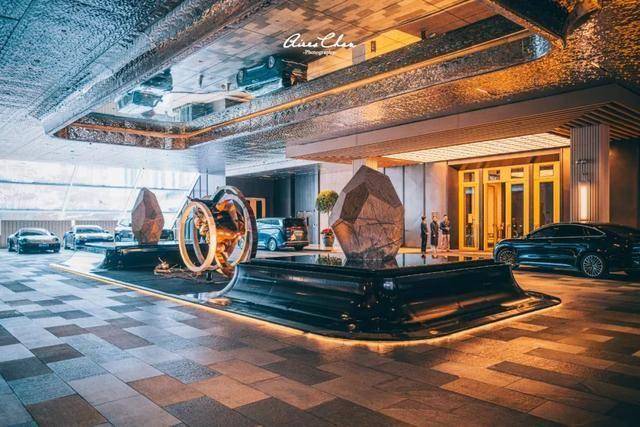 落客大堂位于The Cube之中,门口两个水池里是艺术家沈烈毅的石雕作品「聚盐成塔」,水池之间的艺术装置会不定期更换。