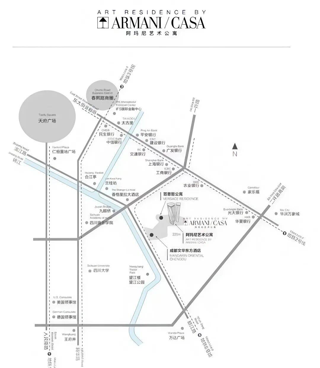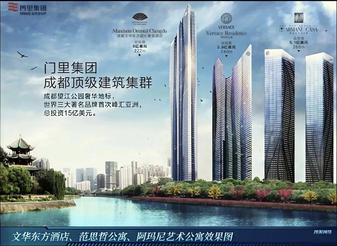 2013年,门里集团携宏大规划登场,不单要将文华东方酒店引入成都,更计划打造由范思哲艺术总监亲自操刀的范思哲公寓,建筑高度超过220米,共68层,与对岸的望江楼公园隔江相望。
