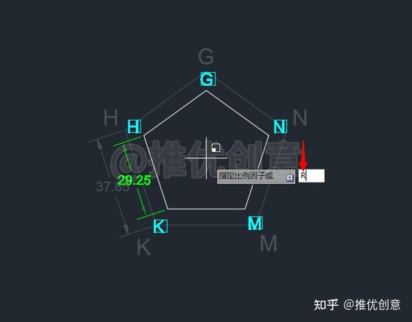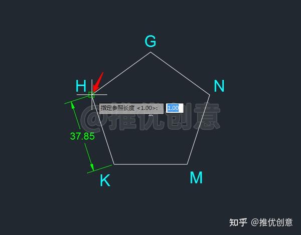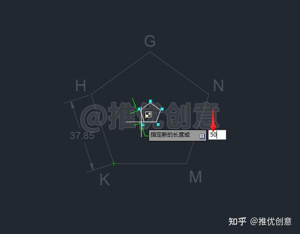 3.13、参照缩放完成后如下图,可以看到正五边形GHKMN的边的长度已经符合原图要求的“50”个单位了。