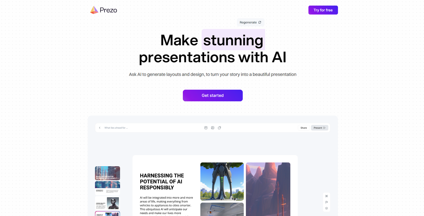 Prezo,一款基于AI生成布局和设计的演示工具,可以将我们的故事转换为一个漂亮的幻灯片。