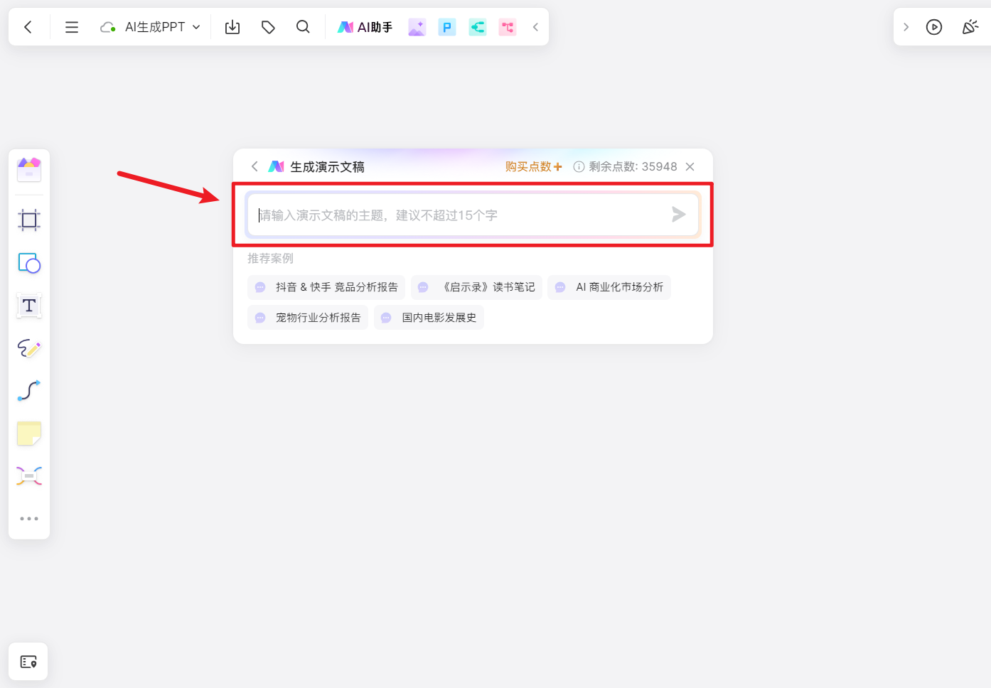 在打开的 boardmix工作台,点击右侧的「生成PPT」,会自动新建一个 boardmix白板文件,同时打开内置的 AI生成PPT功能。