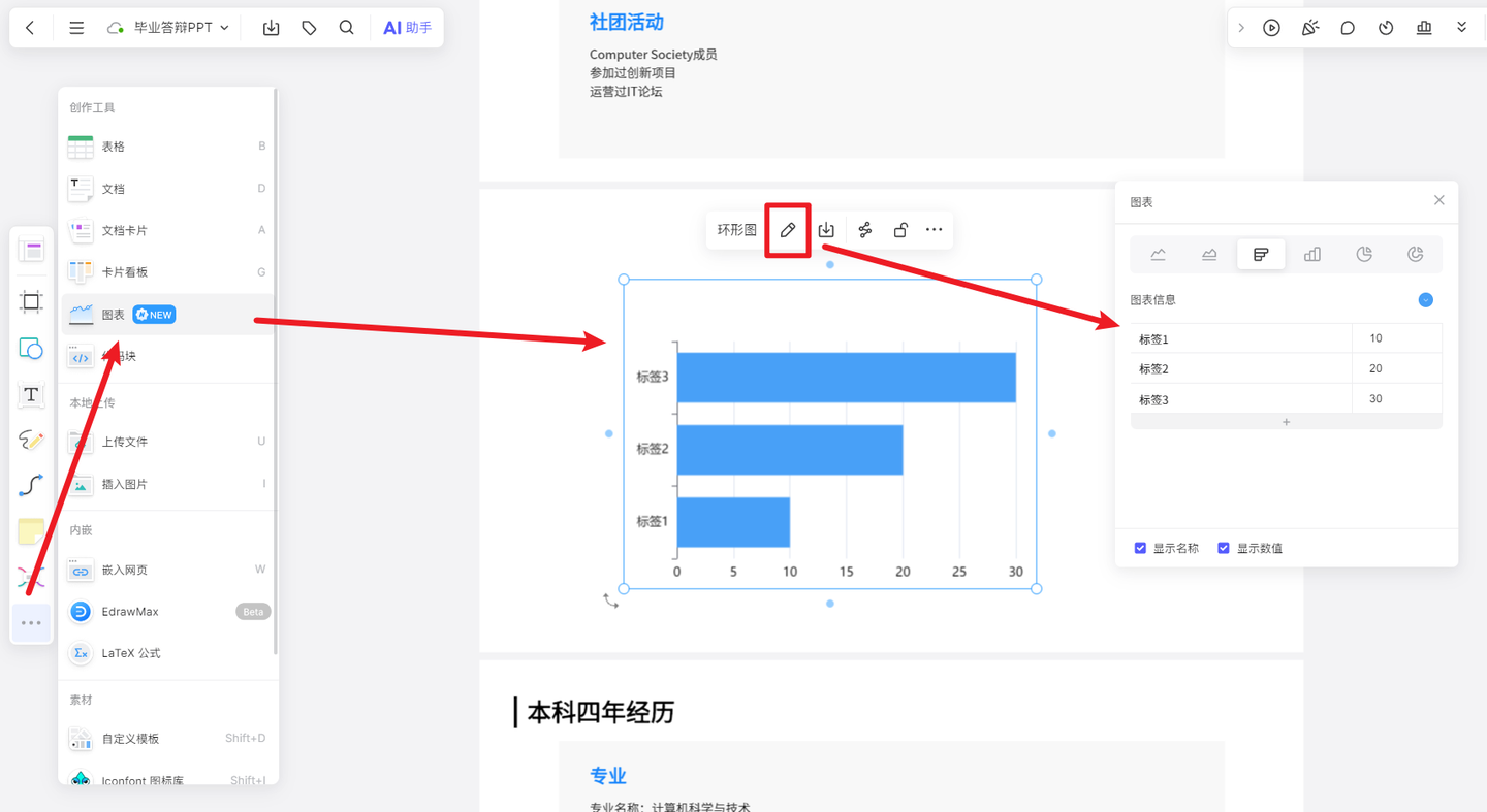 从中选择一种添加到幻灯片页面上,选中刚添加的图表,点击上方工具栏的「编辑」,右侧会打开图表的编辑面板,我们可以更改图表的类型,设置图表的标签、数值,以及是否显示图表名称或数值。