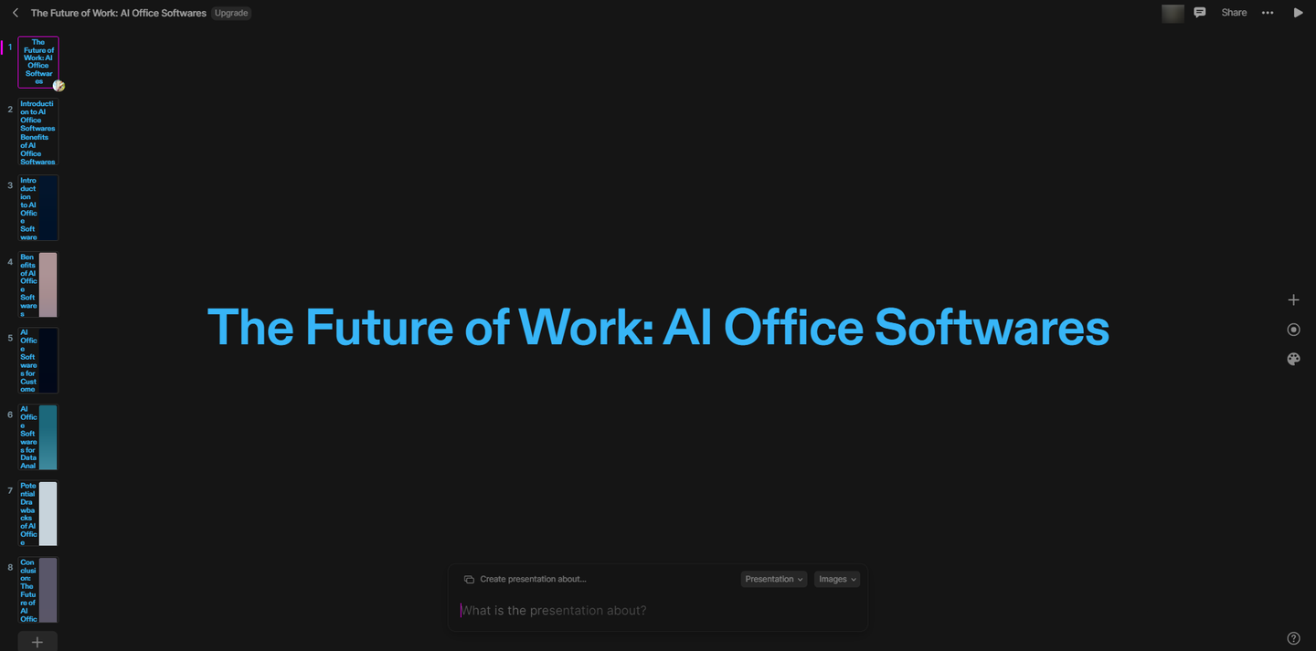 点击tome编辑界面底部的输入框,选择Create presentation about,输入幻灯片的主题,tome就会自动生成一份完整的PPT。