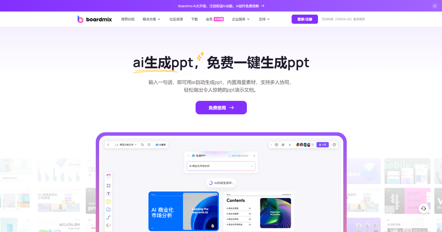 在电脑浏览器打开boardmix博思白板的首页 boardmix.cn/ai-powerpoint,点击中间的「免费使用」,进入 boardmix白板的工作台。