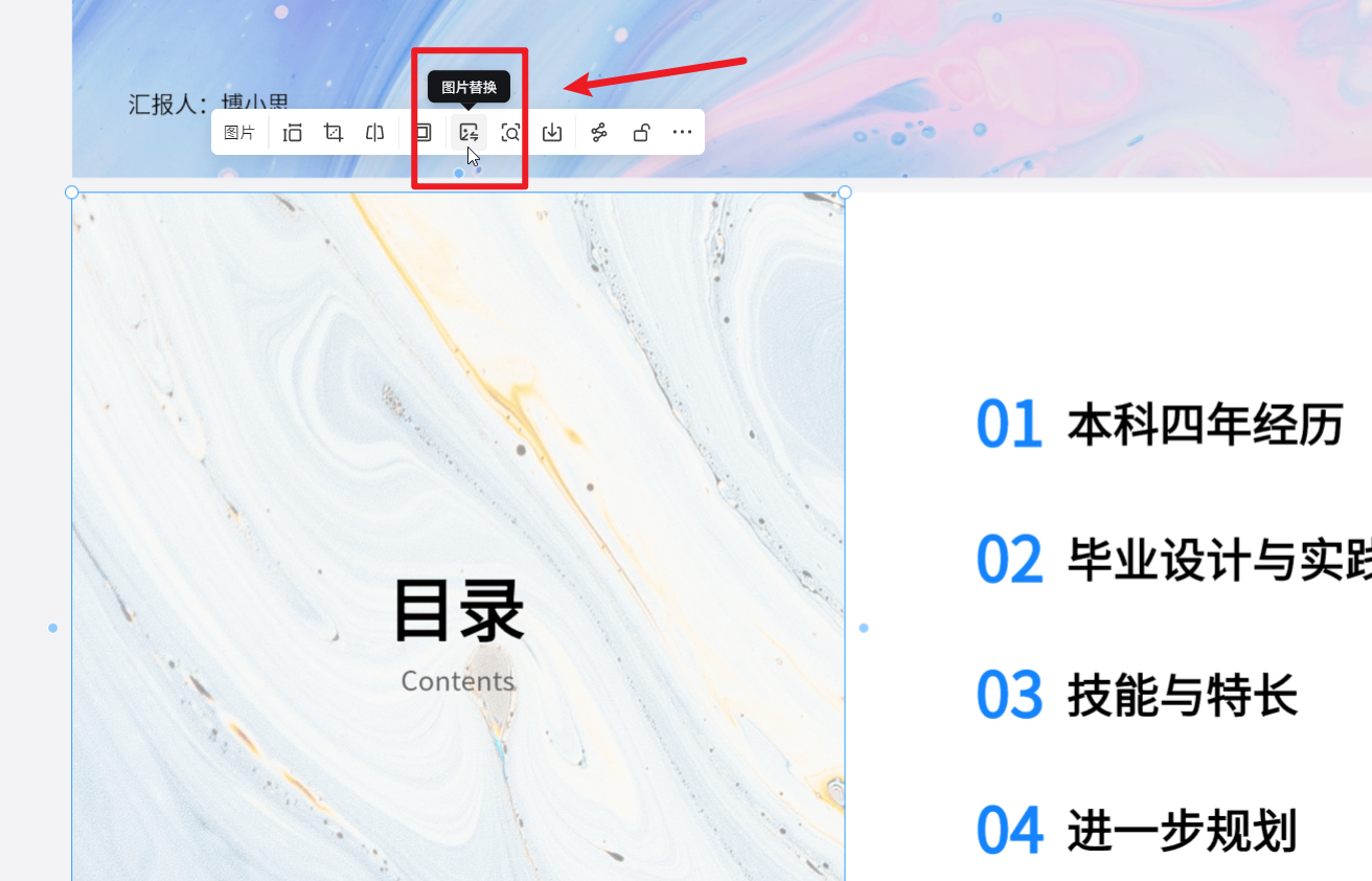 单击选中PPT中包含的图片,点击上方工具栏的「图片替换」,可以上传本地的图片,替换当前选中的图片。
