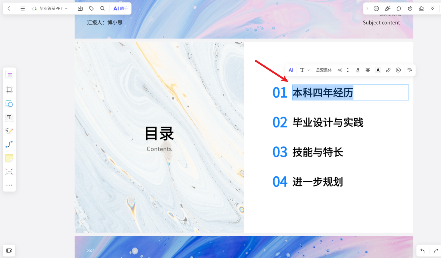 boardmix AI自动生成的PPT,支持自由编辑和修改,以PPT的文本内容为例,双击文本,就能编辑文本框的内容。