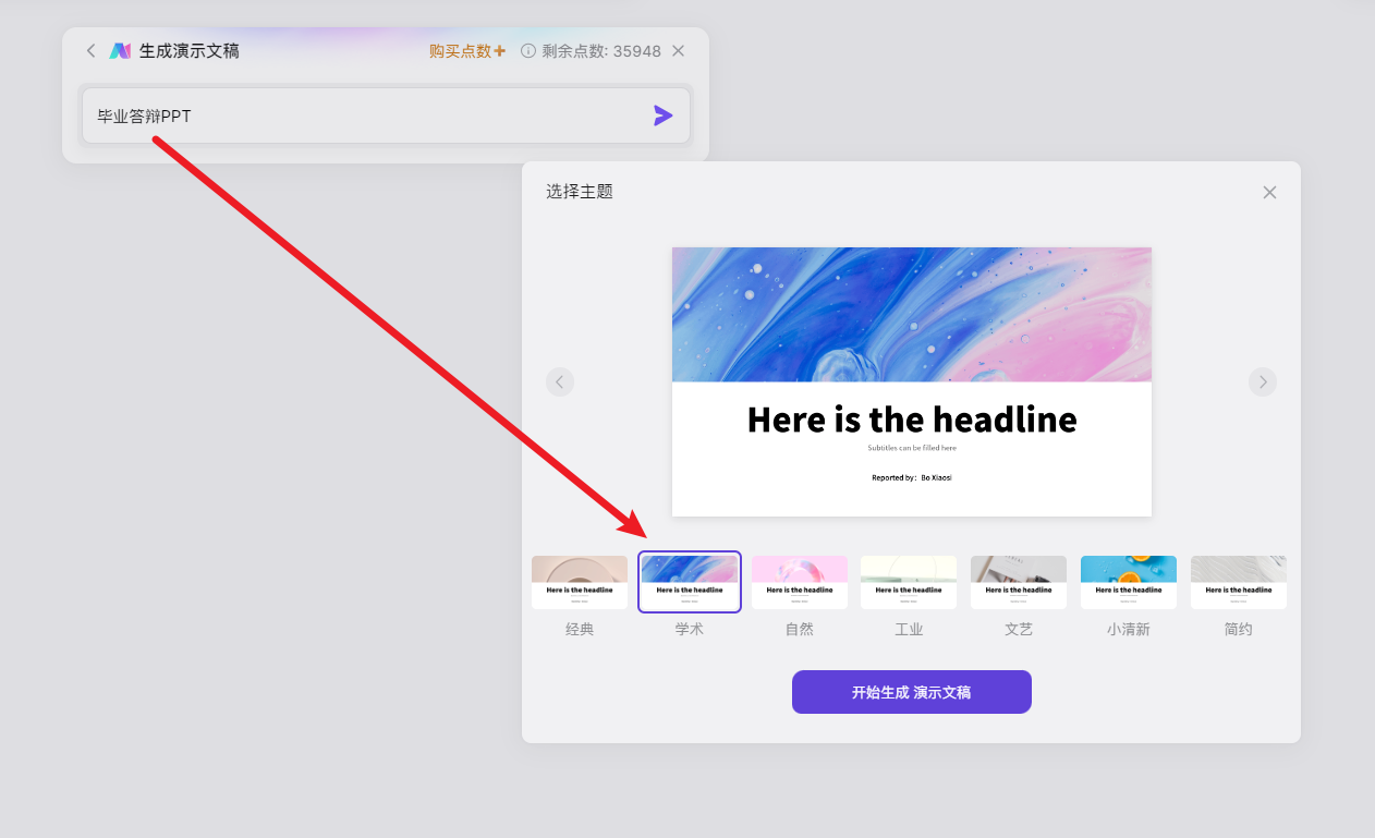 譬如我们想制作毕业答辩PPT,可以在输入框输入「毕业答辩PPT」,按下回车键 Enter,在弹出的页面可选择 PPT的主题,这里提供了 7 种 PPT 风格,包含经典、学术、自然、工业、文艺、小清新、简约。
