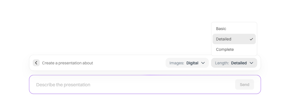 Prezo的交互与前面的tome相类似,在编辑界面的底部输入想要创建的幻灯片主题,右侧可设置插入的图片风格、文档的长度,没有特殊需求,保持默认的设置即可。