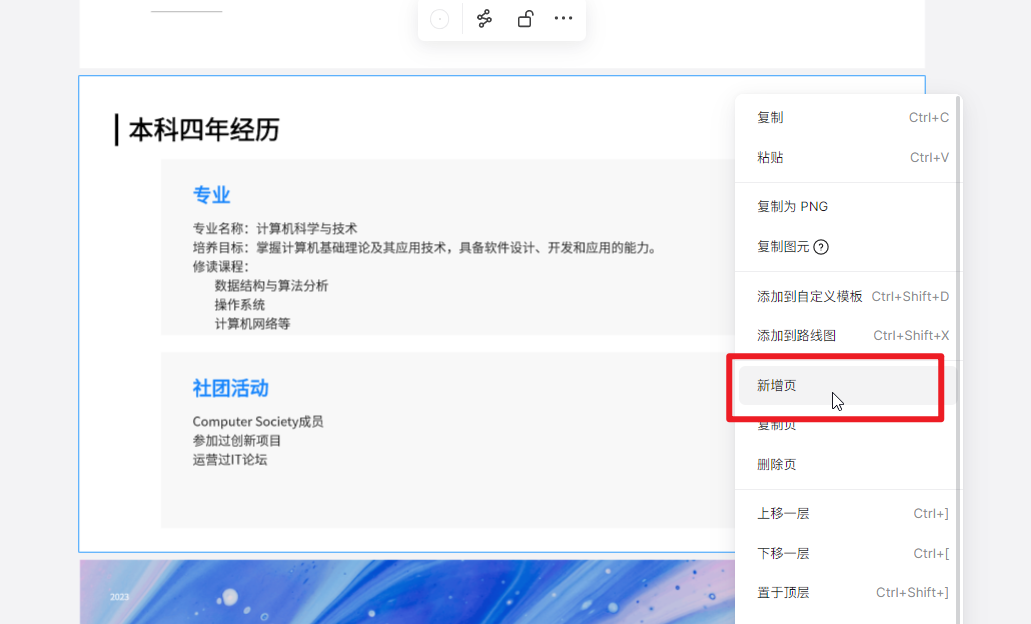 boardmix AI自动生成的PPT只有 11 个页面,我们可以在这基础上增加新的页面,单击选中整个幻灯片页面,右击选择「新增页」,可以在页面的下方添加一个空白的幻灯片页面。