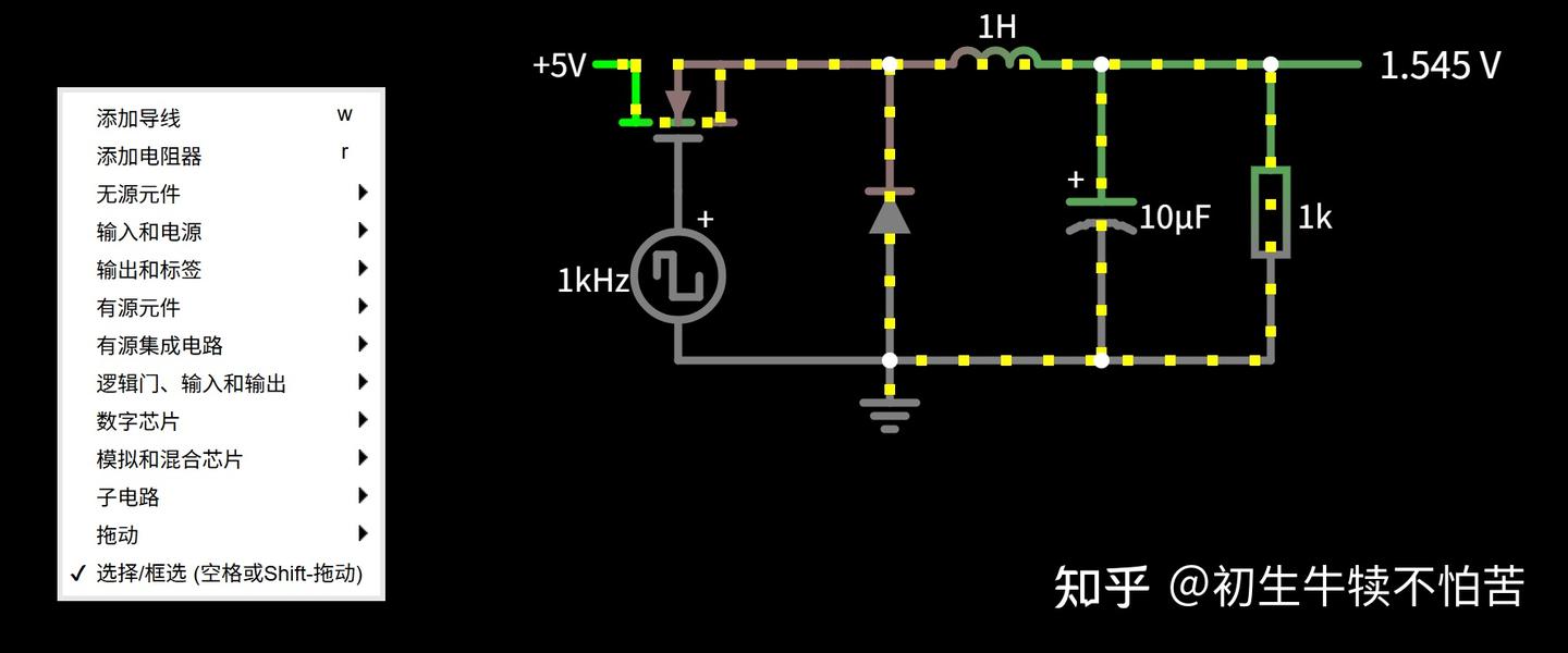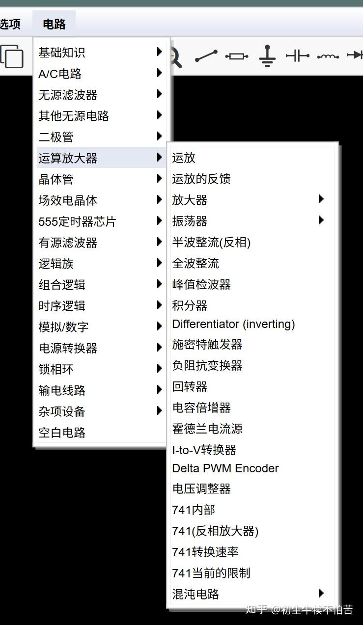 左上角是菜单栏,右键点击可加载新电路,或拖拽元件搭建自己的电路。