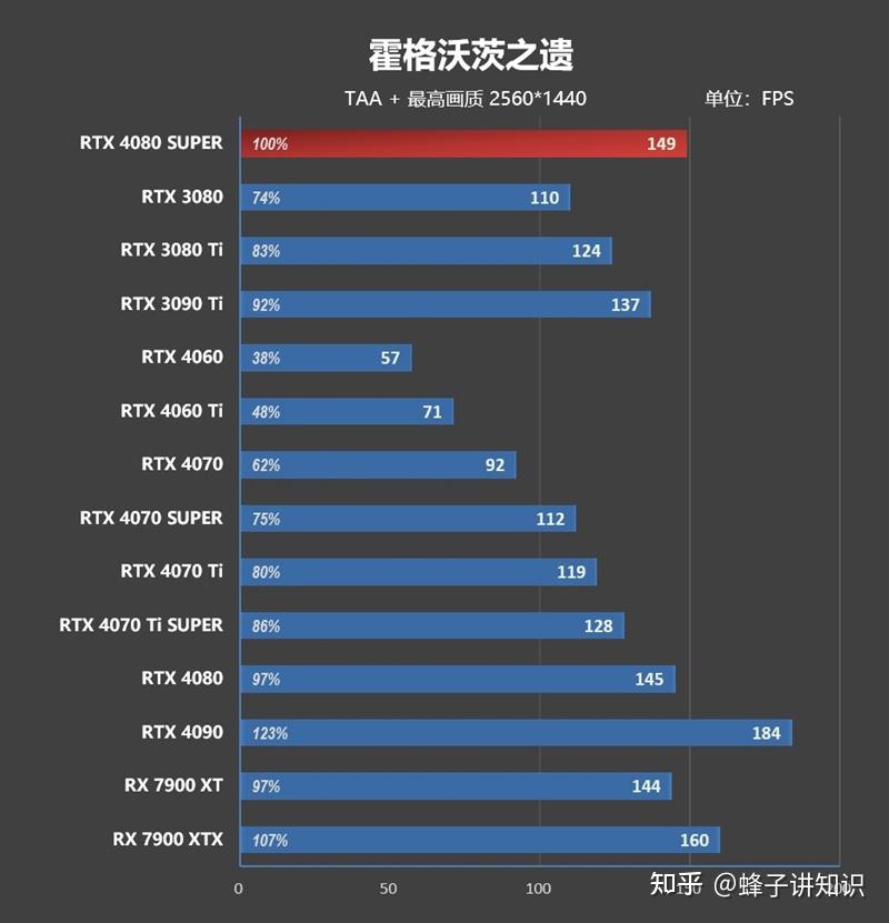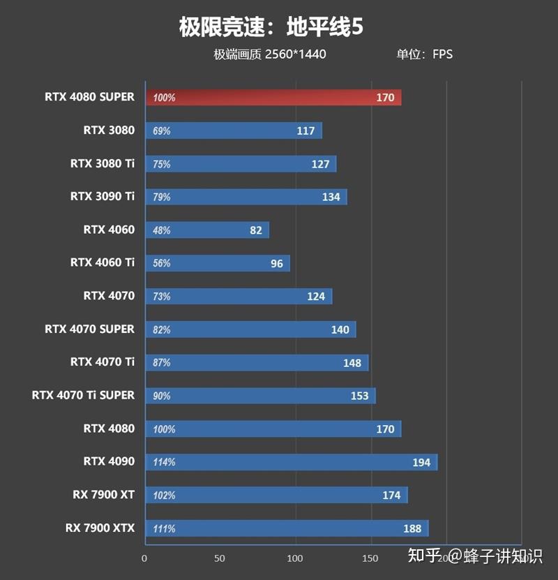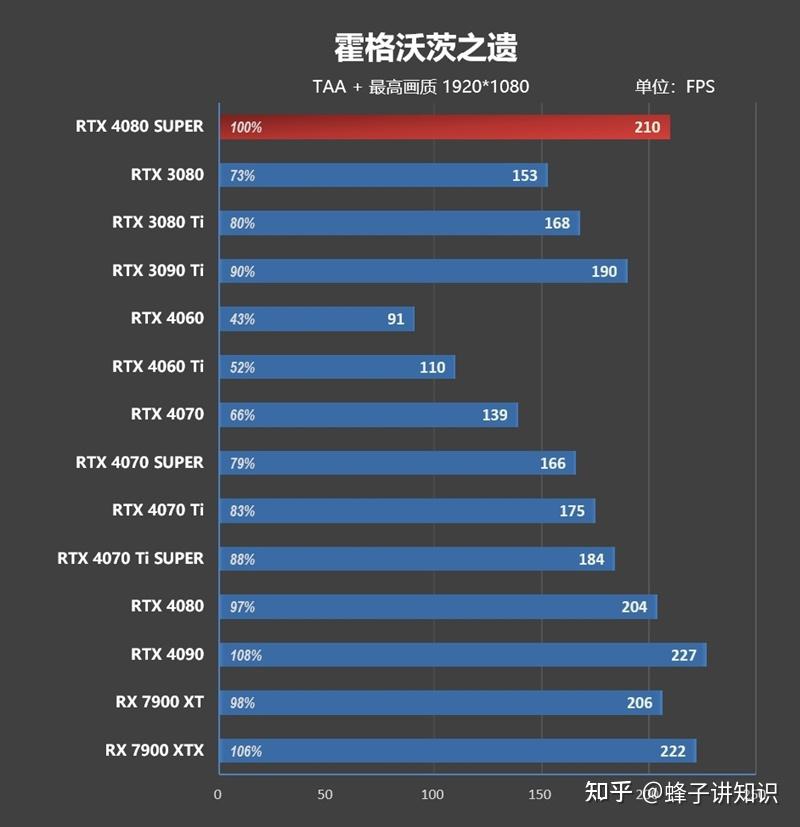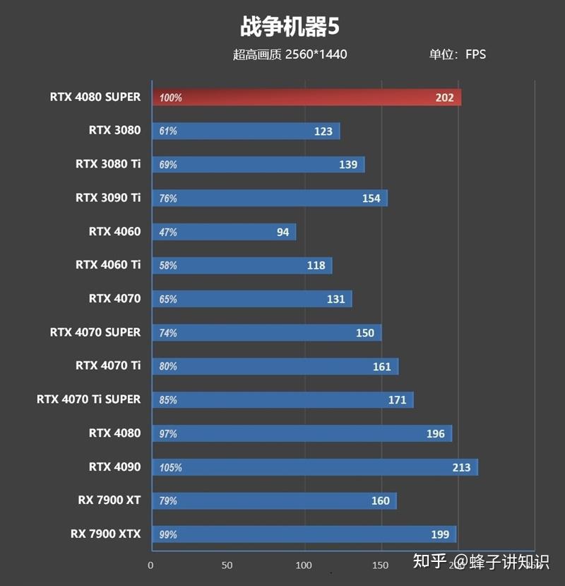 1080p分辨率对于RTX 4080 SUPER这样的显卡已经有点屈才了,我们还是测试了一下供参考,对比RTX 3090 Ti高了足足19%,但是和RTX 4080差别非常小,平均仅1%,《战争机器5》表现最好也不过4%。