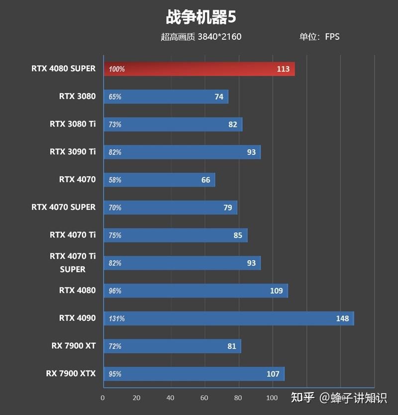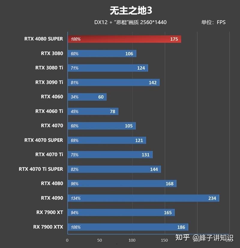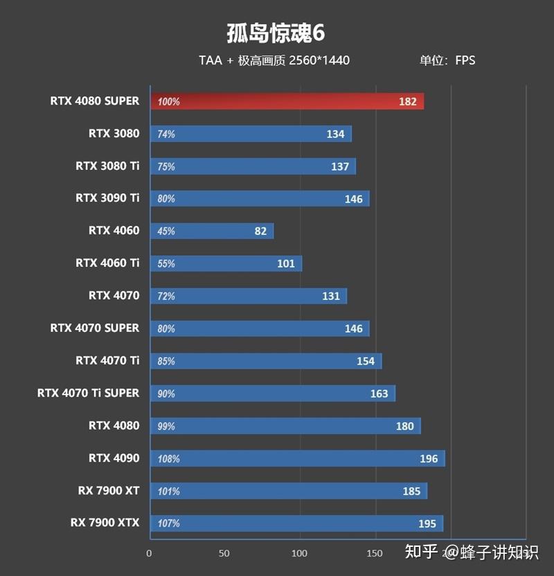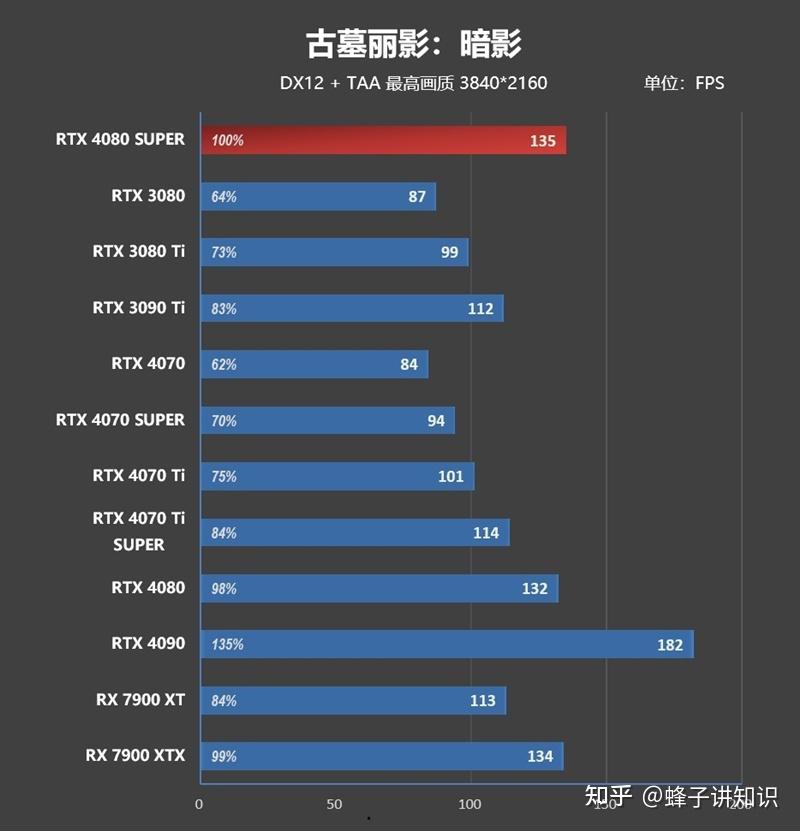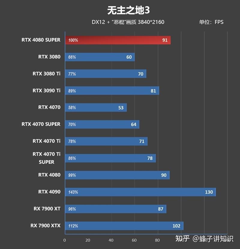 4K分辨率下,RTX 4080 SUPER依旧能够领先RTX 3090 Ti约18%的样子,比RTX 4080快了2%,比RTX 3080 Ti快了31%。