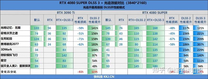 在开启光追和DLSS 3时,RTX 4080 SUPER的平均帧率高出RTX 3090 Ti 50%以上,像《赛博朋克2077》这样的显卡杀手,领先优势则达到了70%。