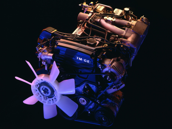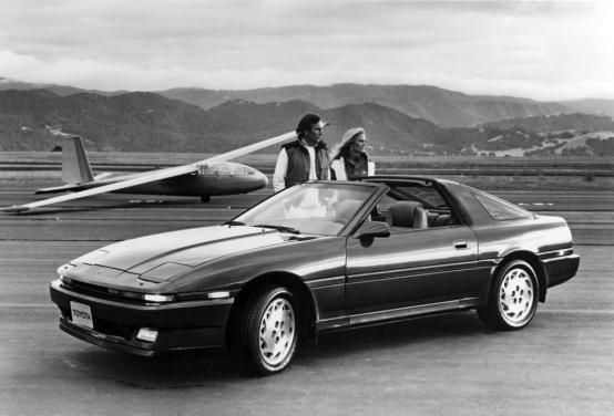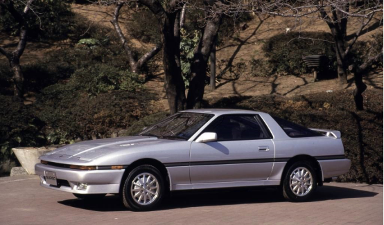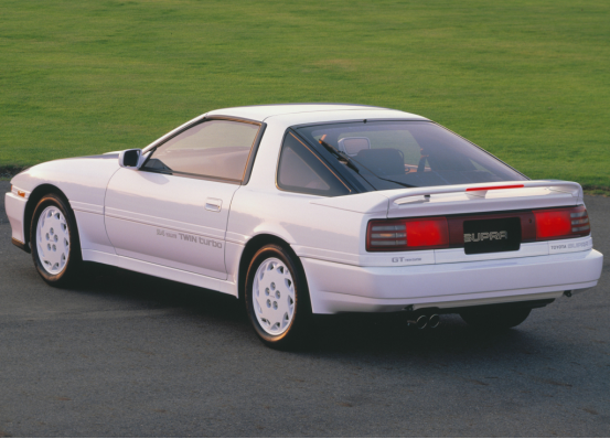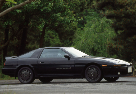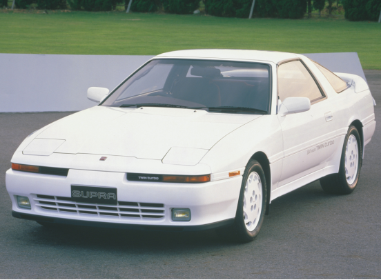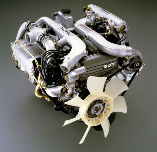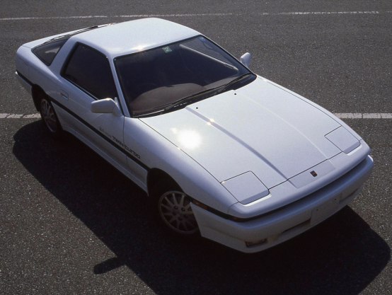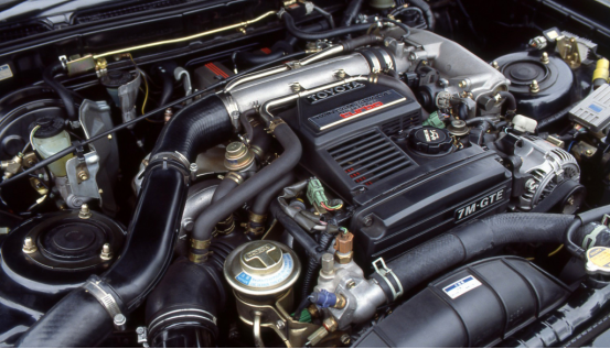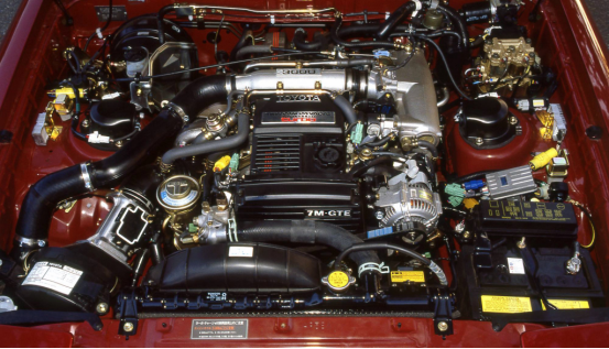 1986年6月,开蓬版Supra开始发售;1987年1月,在日本国内市场正式推出涡轮增压版本的7M-GTE引擎,参数设定大致与自然吸气的7M相同,但进气系统加入了当时丰田的黑科技之一的T-VIS(Toyota Variable Induction System),丰田可变进气系统,令最大马力在涡轮增压及中冷器等的多重帮助下,获得235匹/5600转的数字,而最大扭力则提升至35.1公斤米/3200转,无论最大马力还是最大扭力的峰值转速都要比自然吸气低,对于日常公路巡航等的经济性有一定的帮助,但需要知道,当时的涡轮增压设定与今天流行的小排量加涡轮的设定完全不同,当时的涡轮增压代表高性能而非经济性考量,一般涡轮需要到30000转左右才会开始涌现出扭力感,而且那种突如其来的推背感更加不是那些小排量涡轮引擎可以比拟的,当然,从使用上更讲求技巧,当然也正是如此,才会让人怀念那个年代开车、尤其是开那些涡轮增压快车的感觉。涡轮版本的变速箱代号是R154,最高时速为232 kph。同年发布的还有两公升排气量涡轮增压版本的Supra 2.0 24V GT Twin Turbo(GA70)型号,使用1G-GTE引擎,最大马力为185匹/6200转、最大扭力24.5公斤米/3200转。