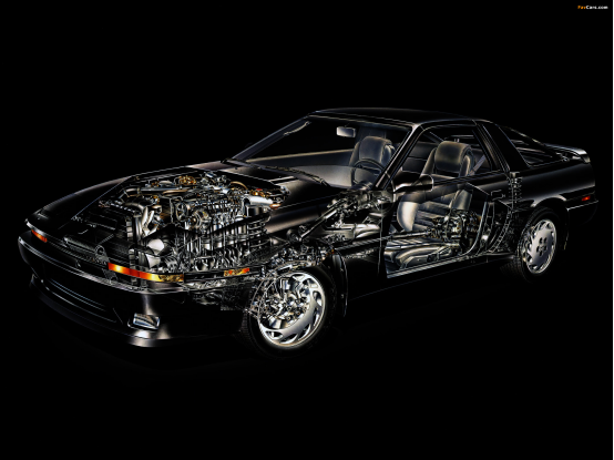 1986年2月,随着Celica狮力架的转款,Celica Supra正式分道扬镳,Celica转而使用丰田的T平台开始变成一辆前驱车,而Supra则继续对原来的后驱平台进行改进,而之所以将之称为“平台”,当然明白孤木不成林这个道理了,正如Supra脱胎于Celica一样,另外一台对日后丰田跑车发展极为重要的一款车型:Soarer同样与Supra结义金兰,前者定位为一台豪华化的跑车、而后者则更为纯粹些。既然作为一辆跑车,而且主力市场放在竞争激烈的北美市场甚至传统的跑车发源地的欧洲市场,没点儿硬货是不行的,作为专门为Supra使用的专用车架底盘,第三代Supra的前后悬挂形式均为双摇臂设计,虽然车重达到了1550公斤(MT)甚至1630公斤(AT),但其通过合理的引擎变速箱放置和布局,让这台轴距长达2596mm的大型跑车,能拥有非常不错的前后配重比,悬挂形式运动化、加上避震套件率先采用了丰田电子悬挂系统(TEMS-Toyota Electronic Modulated Suspension),它设定绝非那种软绵绵的“舒适感”,而是具有清晰路感的可变过滤能力、加上较为合理的前后配重之下(53:47),让这台A70系Supra在市场上大获好评,从1986年2月至1993年4月停产,全球销量高达24万辆,而日本国内其实只有不到10万辆,由此可见它已经逐渐成为当年日系旗舰级跑车的代表作。