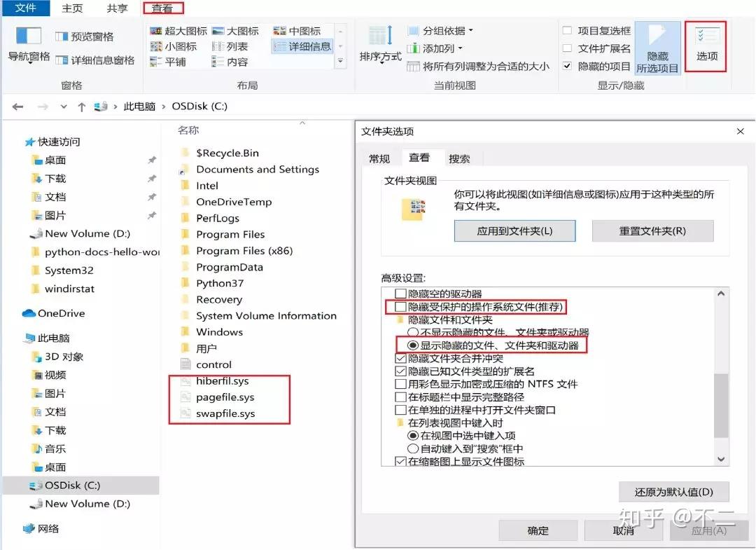 点击查看-> 选项 -> 文件夹选项 -> 查看, 去掉“ 隐藏受保护的操作系统文件(推荐)” 前面的勾,选择“显示隐藏的文件,文件夹和驱动”,C 盘下面会出现三个文件hiberfil.syspagefile.sys 还有swapfile.sys