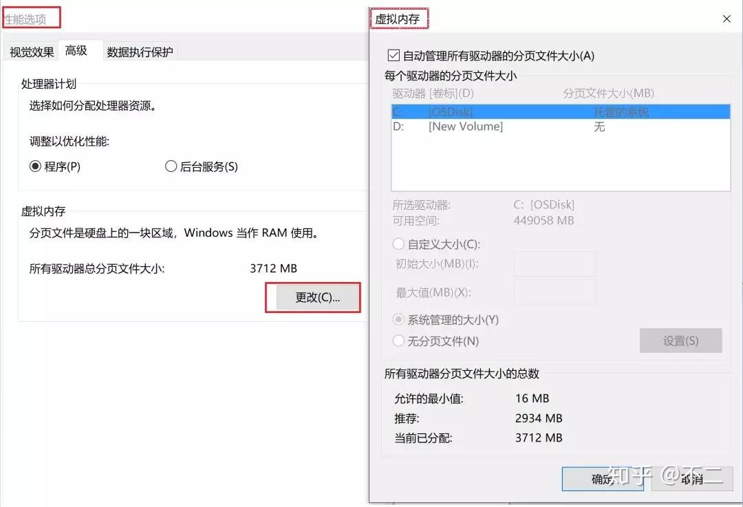 打开性能选项,更改虚拟内存。默认情况下是自动管理所有的分页文件大小