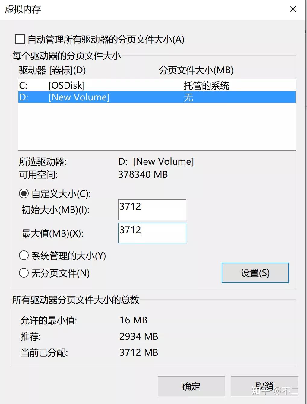 我们可以将“自动管理所有驱动器的分页文件大小”前面的勾去掉,手动管理paging file 的大小。点击C盘,选择“无分页文件”,选择D 盘 -> 自定义大小,可根据推荐大小填写。重启之后更改才能生效。