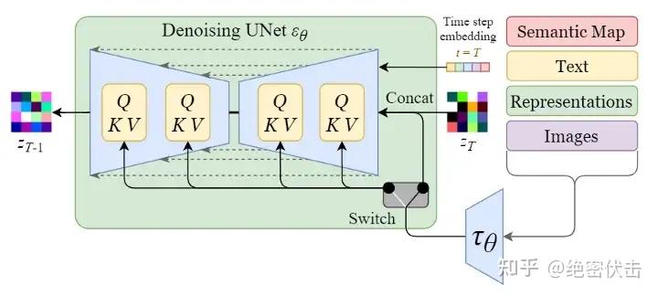 Stable Diffusion在反向扩散过程中其实谈不上改进,只是支持了文本的输入,对U-Net的结构做了修改,使得每一轮去噪过程中文本和图像相关联。在上一篇文章(绝密伏击:十分钟读懂Diffusion:图解Diffusion扩散模型)中,我们在介绍使用Diffusion扩散模型生成图像时,一开始就已经介绍了在扩散过程中如何支持文本输入,以及如何修改U-Net结构,只是介绍U-Net结构改进的时候,讲的比较粗,感兴趣的可以去看看里面的第一节。下面我们就补充介绍下Stable Diffusion是如何对U-Net结构做修改,从而更好的处理输入文本。