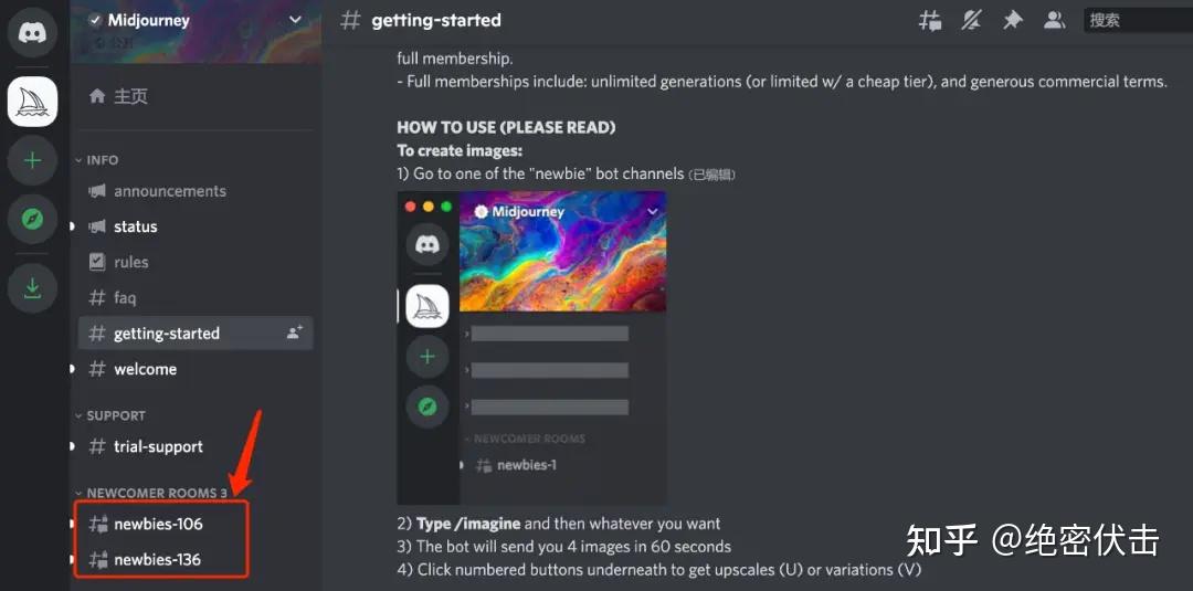 可以看到上图中显示用户数是381万,当前在线30万。用户使用Midjorney也非常简单,只需要点击主页左下方的newbie频道便可进入。
