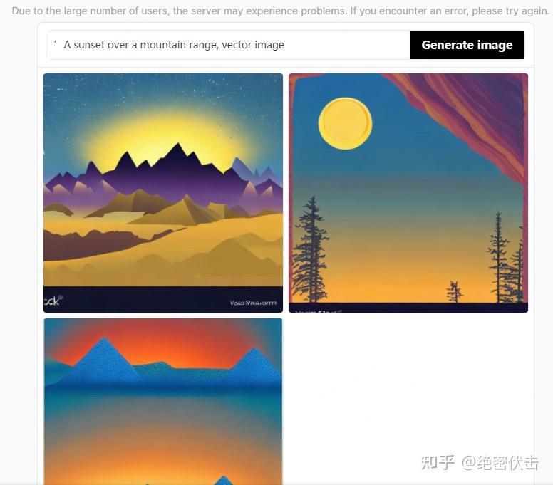 大家可以去Stable Diffusion Online这个网站体验一下Stable Diffusion,我们输入文本“’A sunset over a mountain rangevector image”(山脉上的日落),看一下效果: