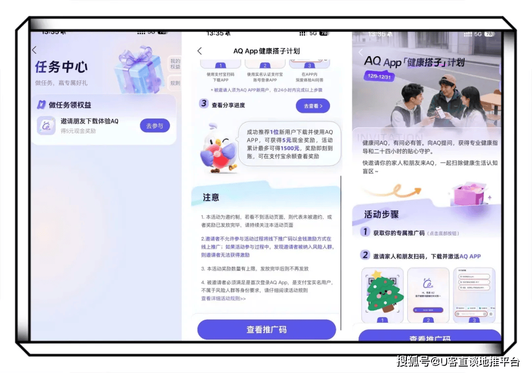 - 根据操作页面,按步骤完成拉新坐也活动,即可赚取官方蚂蚁阿福推广5/单的佣金收益。
