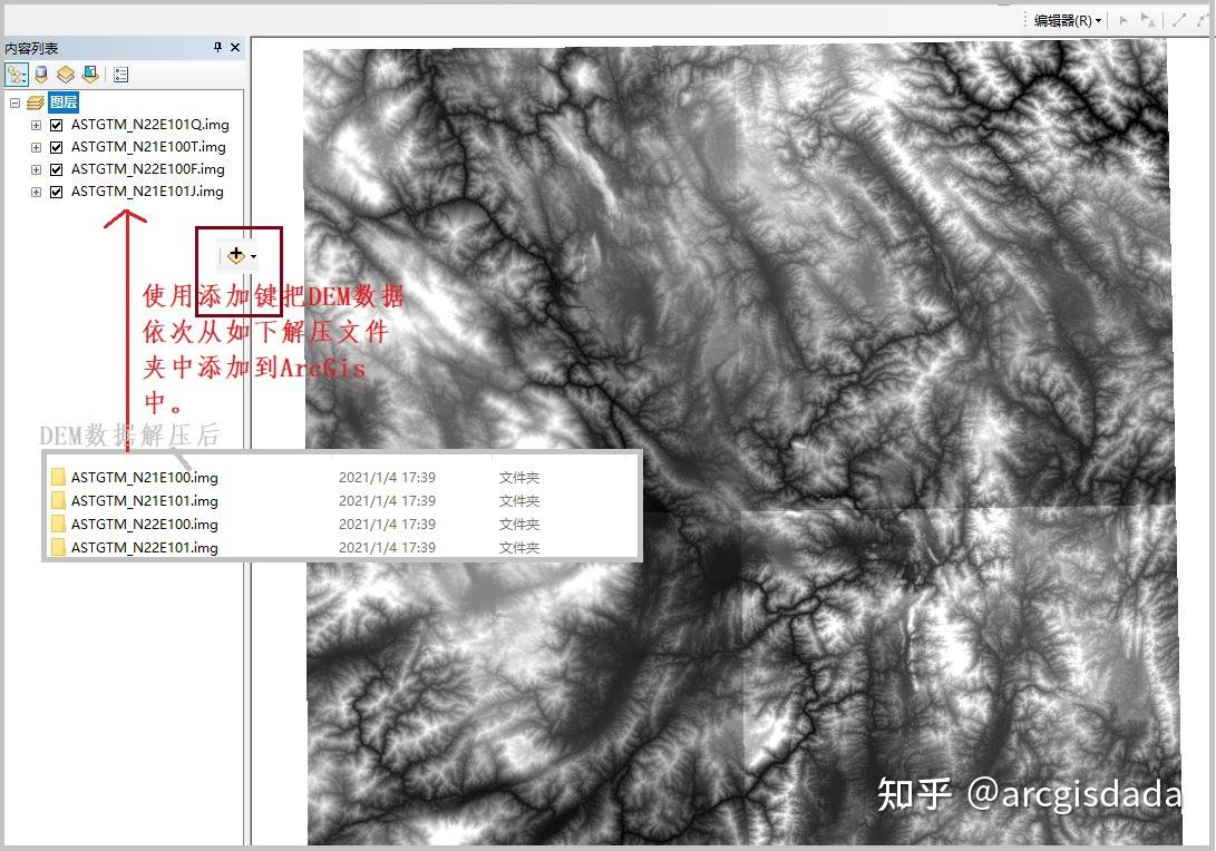 下载的DEM数据是一个压缩包,需要解压如图1-2所示的文件夹,然后使用添加键将其添加至ArcGis中即可。