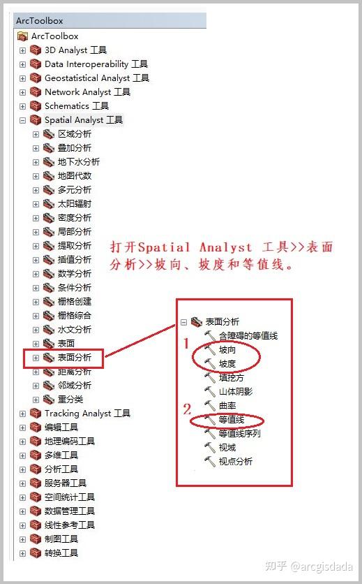 打开ArcGis的ArcToolbox,如图1-3所示。可以看到这里面的工具有很多,今天主要使用的是Spatial Analyst 工具,对其属性的描述为:ArcGIS Spatial Analyst extension为栅格(基于像元的)数据和要素(矢量)数据提供一组丰富的空间分析和建模工具。打开Spatial Analyst 工具>>表面分析>>坡向、坡度和等值线。