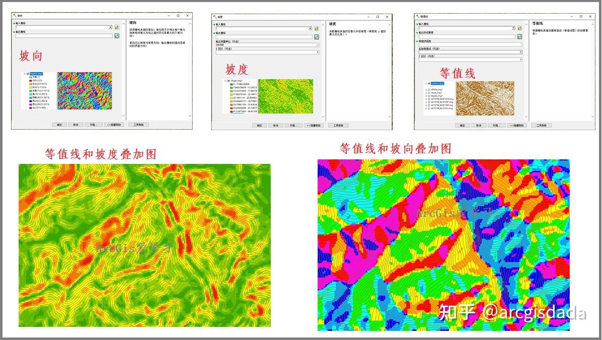 坡向、坡度以及等值线的工具窗口和制图成果如图1-4所示。
