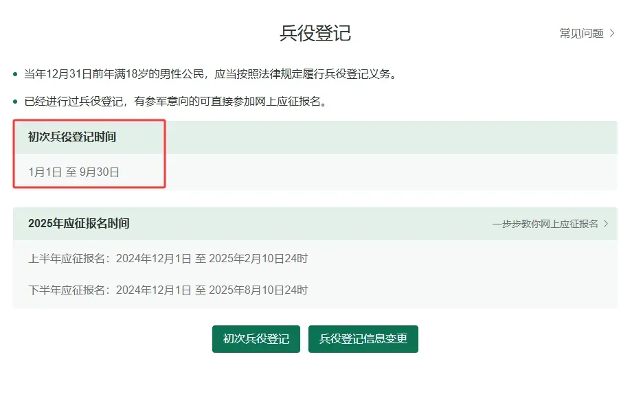 答:已进行过兵役登记,年满24周岁以内的男性公民,每年应对本人兵役登记情况进行核验,本人情况有变化的请及时更新兵役登记信息。