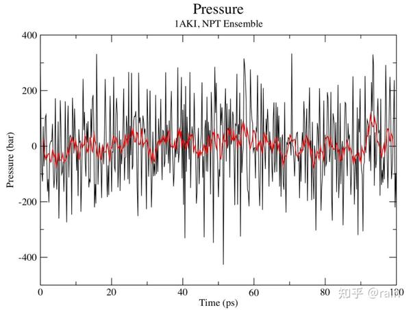 前一步的NVT平衡稳定了体系的温度. 在采集数据之前我们还需要稳定体系的压力(因此还包括密度)。压力平衡是在NPT系综下进行的其中粒子数压力和温度都保持不变。这个系综也被称为等温等压系综最接近实验条件。100 ps NPT平衡的命令如下: