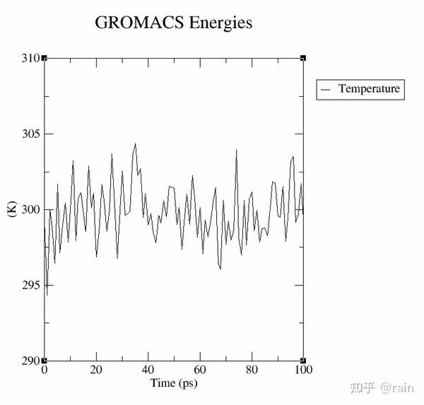 echo 16 0 |gmx energy -f nvt.edr -o temperature.xvg结果如下所示,温度基本保持在300K,如果波动太厉害可以考虑增加nstes步数来进一步获取平衡体系。