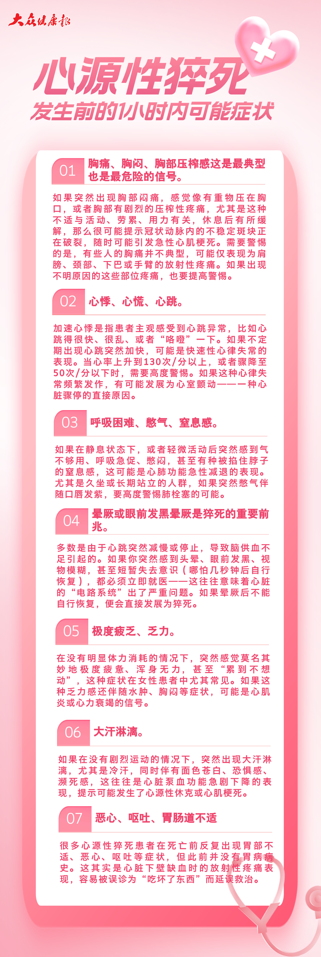 特别提醒:经确诊冠心病、心肌病、心力衰竭、心律失常等高危人群更要警惕,出现上述信号时,猝死风险更高。
