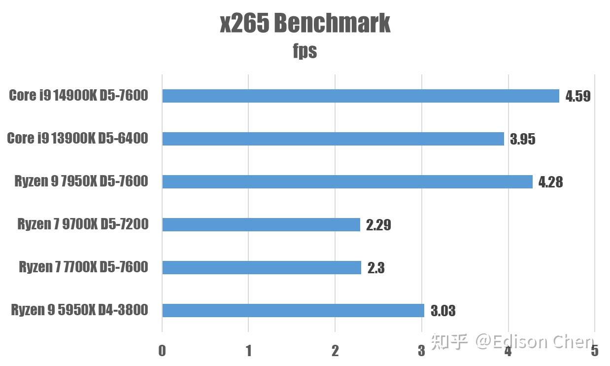 AMD 提供的 65W TDP(~88W PPT)在某些情况下会严重限制 Ryzen 7 9700X 的性能发挥,这在 x265 测试中有体现。