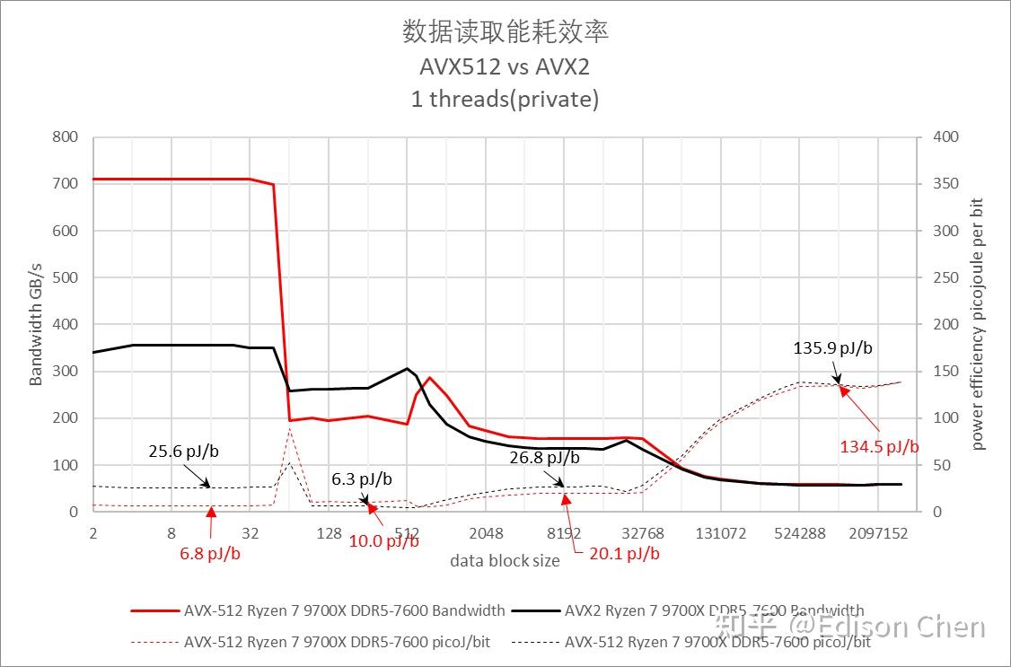 在 1GiB 时,AVX512 的能耗比为每 bit 134.5 皮焦耳(比 7700X 降低 26.1%),AVX2 为 132.3 皮焦耳(比 7700X 降低 7.3%)。