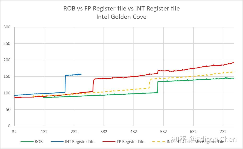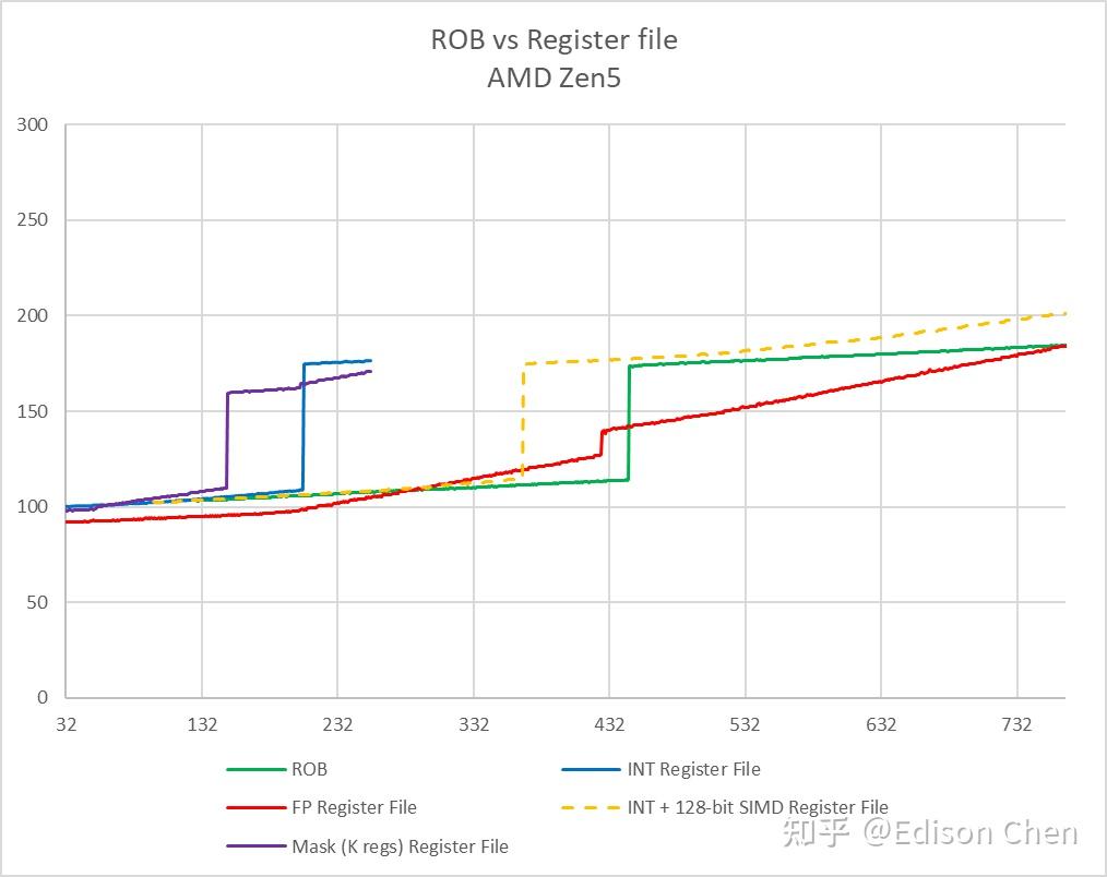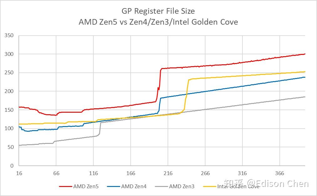 从程序员角度观察,Intel Golden Cove 和 Zen5 的整数寄存器堆大小比较接近,Zen5 的浮点/向量寄存器堆要大不少,但是在整数指令和向量指令混合的时候,Golden Cove 的规模更有优势。