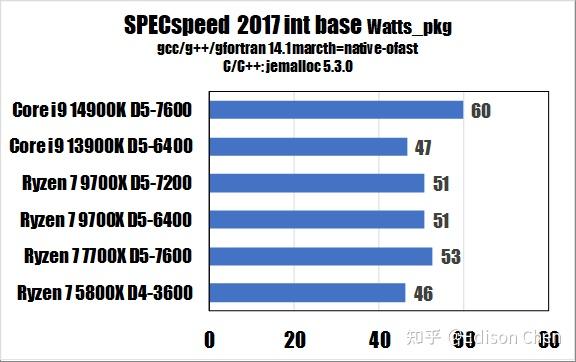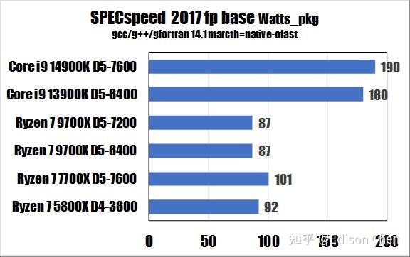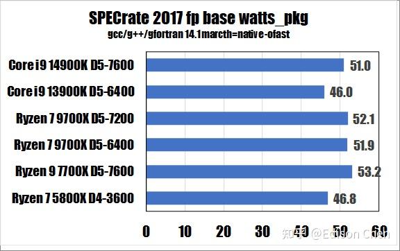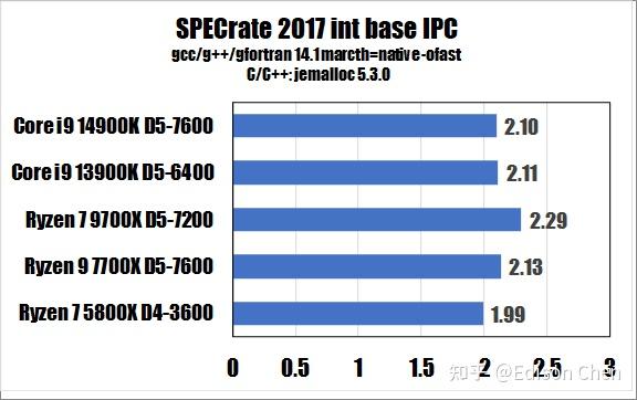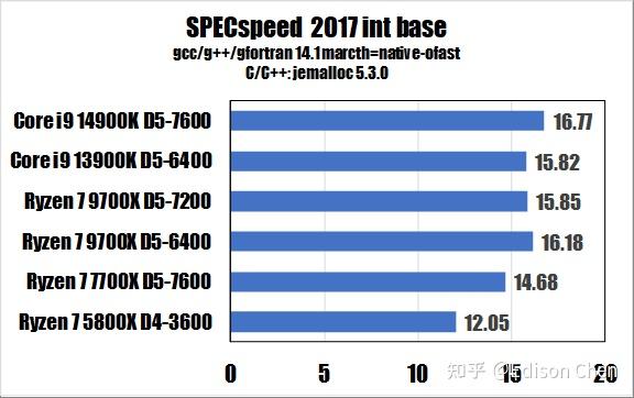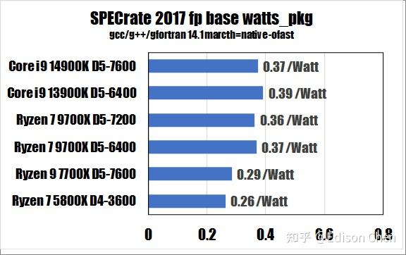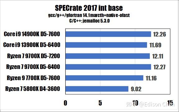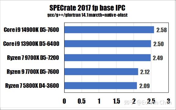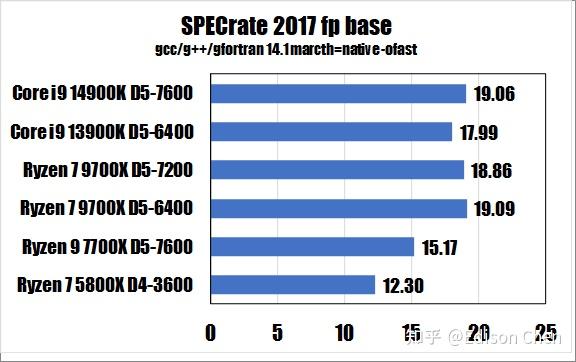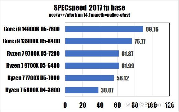 以 SPEC CPU2017 的单任务程浮点类测试 fprate 1-copy 为例,在 GCC 14.1(march=native 或znver4、-Ofast)为编译器时,Ryzen 9 7950X 的得分为 15.5,而它的对手 Core i9 14900K 是 19.2,前者是后者的 81% 不到。这是单线程的情况,Intel 现在采用了混合架构,拖着一大堆 E-Core,所以在强调吞吐能力的浮点应用中,AMD Zen4 会比较吃亏。
