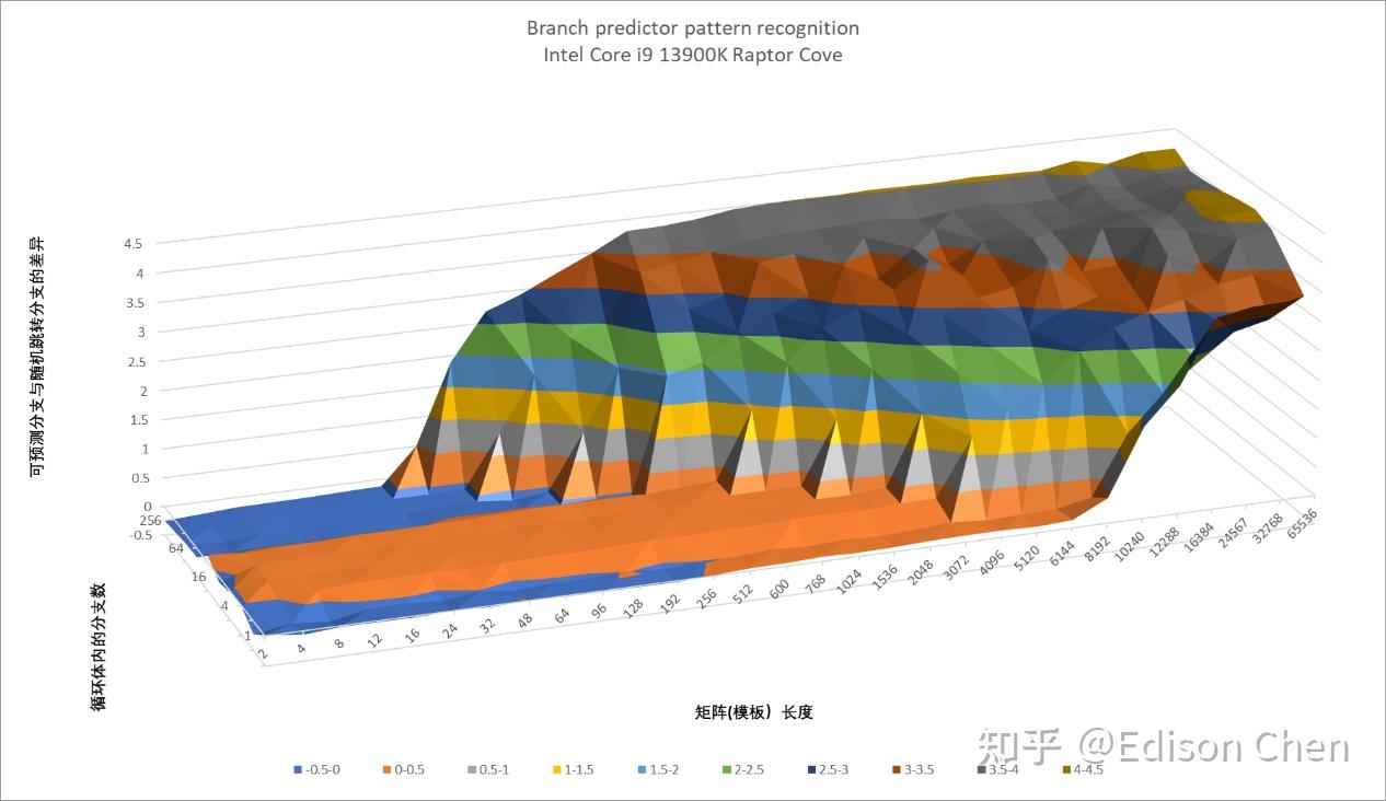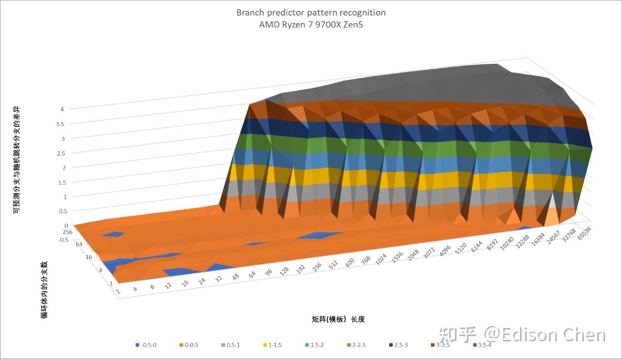 上面这几张图分别是 Zen5、Zen4、GoldenCove 的分支预测模式识别曲面图,测试的分支预测类型方向预测。